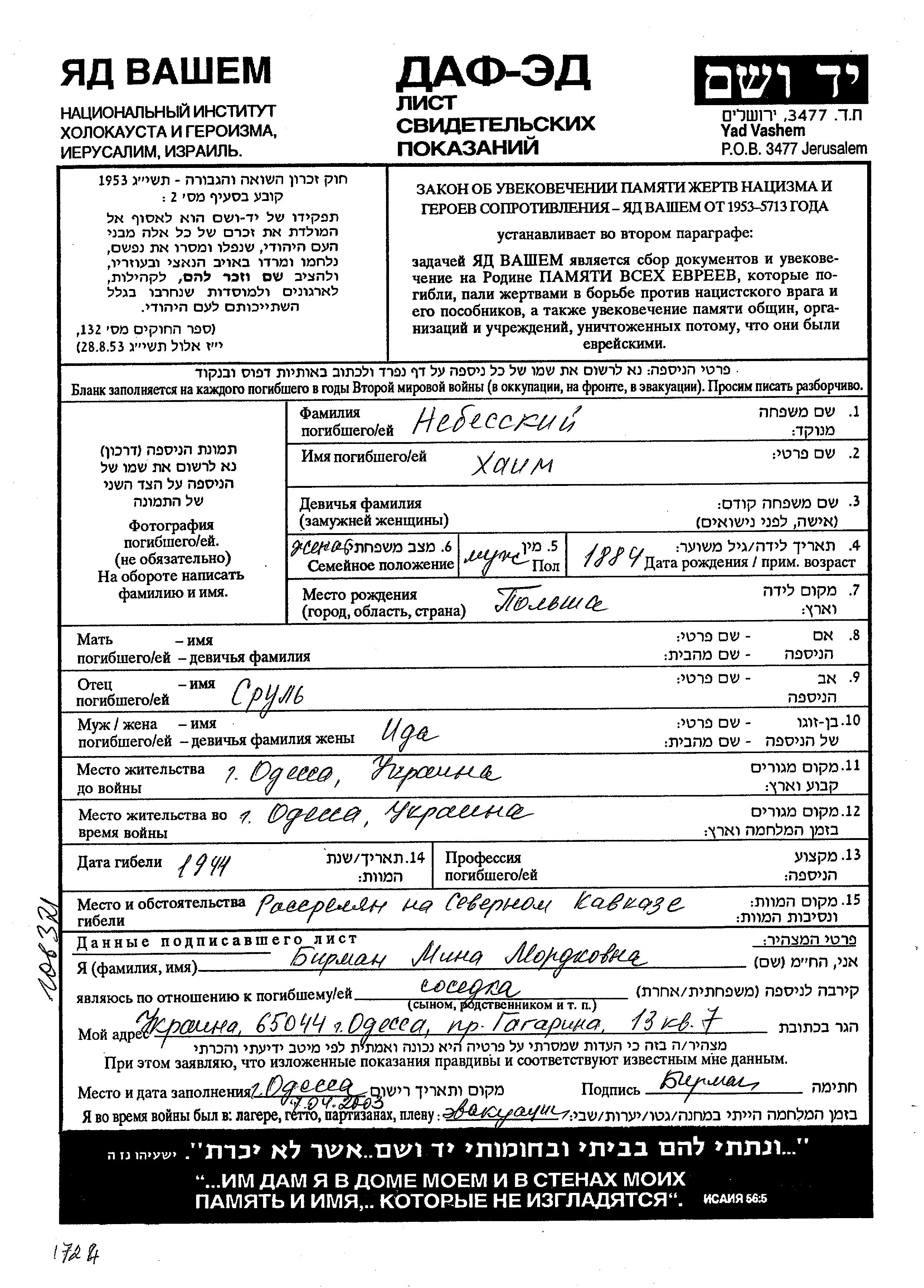 Khaim Nebeski est né à Pologne en 1884, fils de Srul. Il était Mariée à Ida. Avant la seconde guerre mondiale il vivait à Odessa, Ukraine (URSS). Au cours de la guerre, il était à Odessa, Ukraine (URSS).