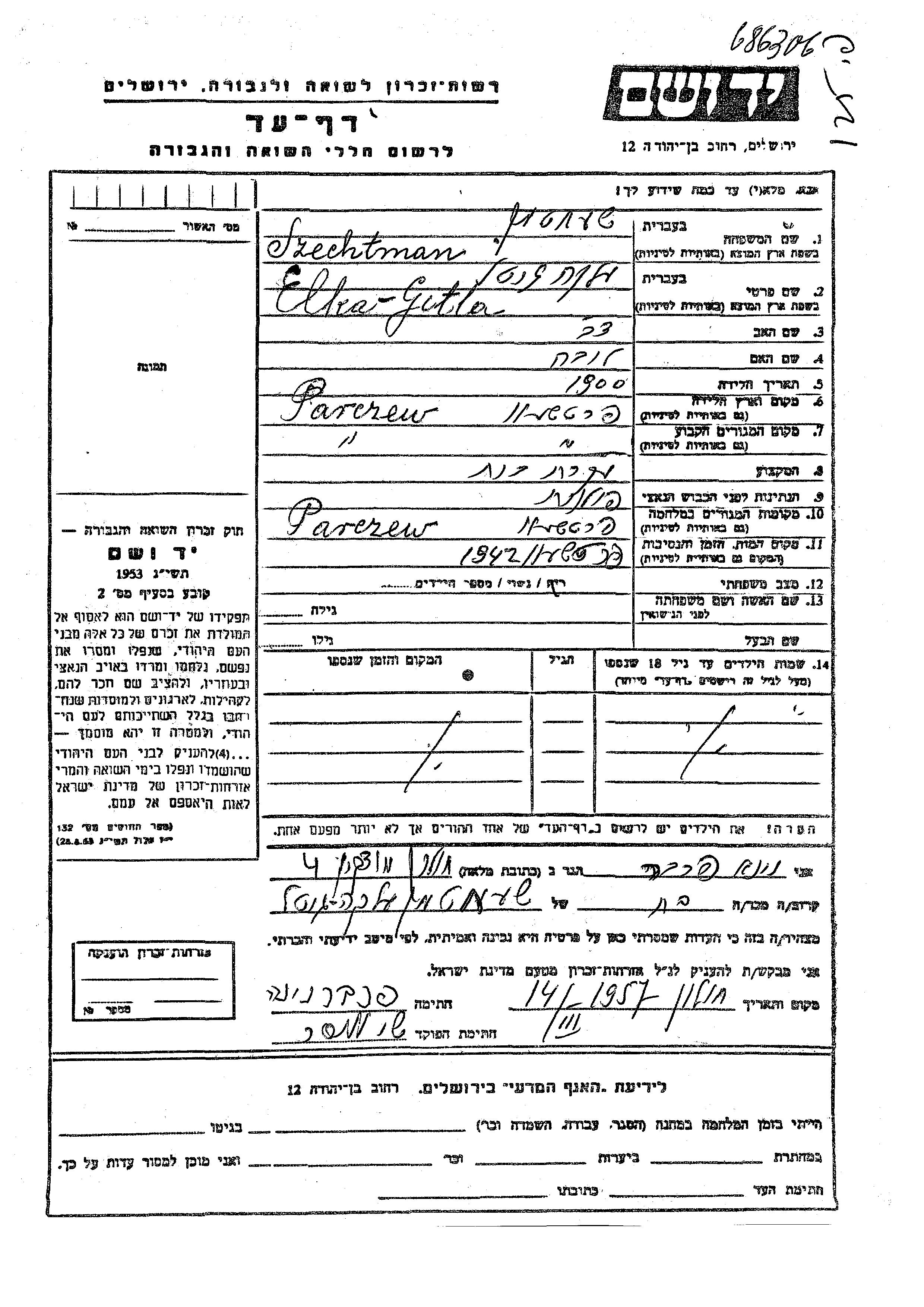 Szechtman Elka Gitla 1900 Parczew, Pologne Feuille de témoignage