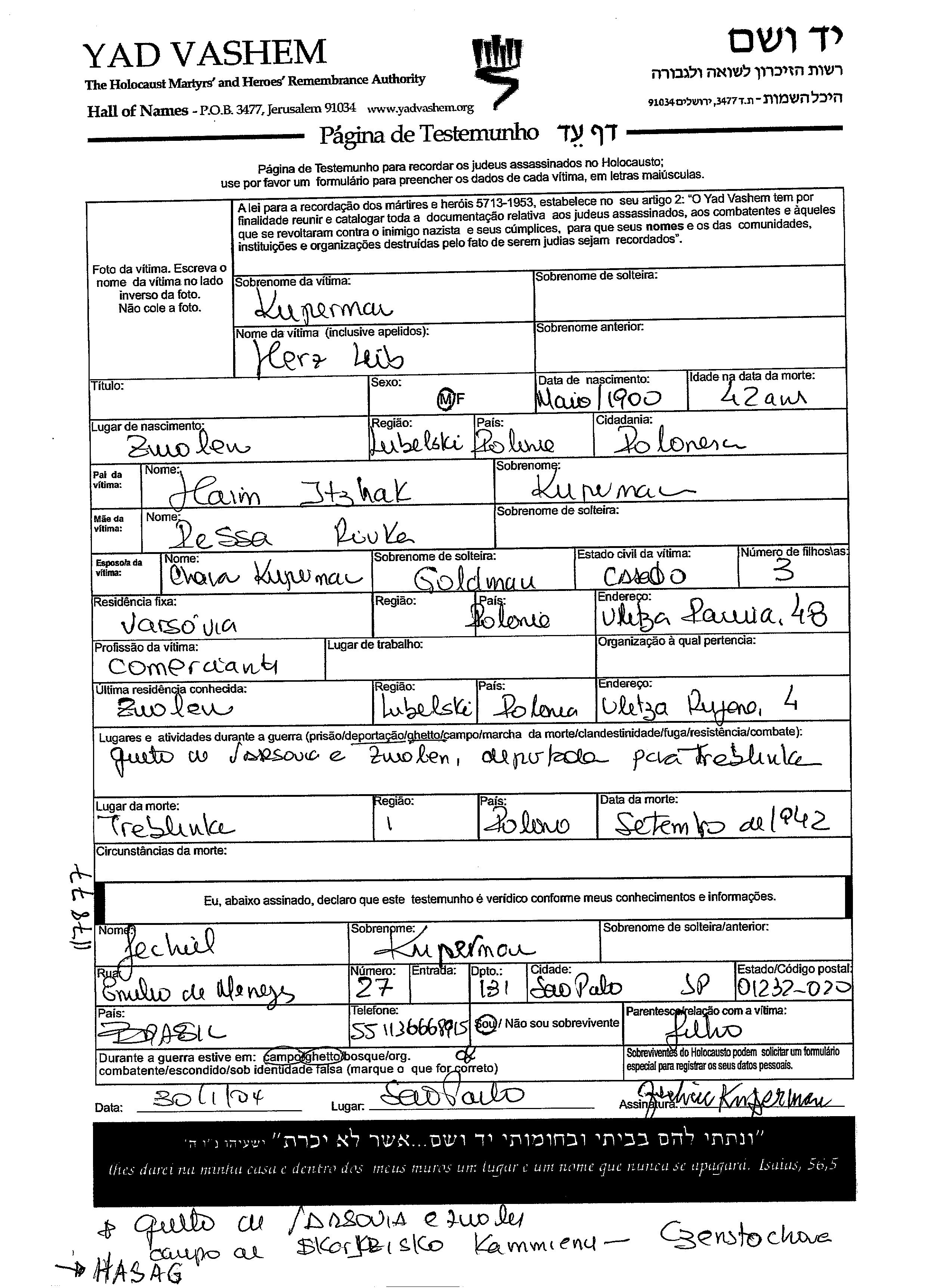 Leib Herz Kuperman est né à Zwolen, Pologne en 1900, fils de Itzhak Haim et de Rivka Pessa. Il était Commerçant/e et Mariée à Chava née Goldman. Avant la seconde guerre mondiale il vivait à Warsaw, Pologne. Au cours de la guerre, il était à Zwolen, Pologne.
