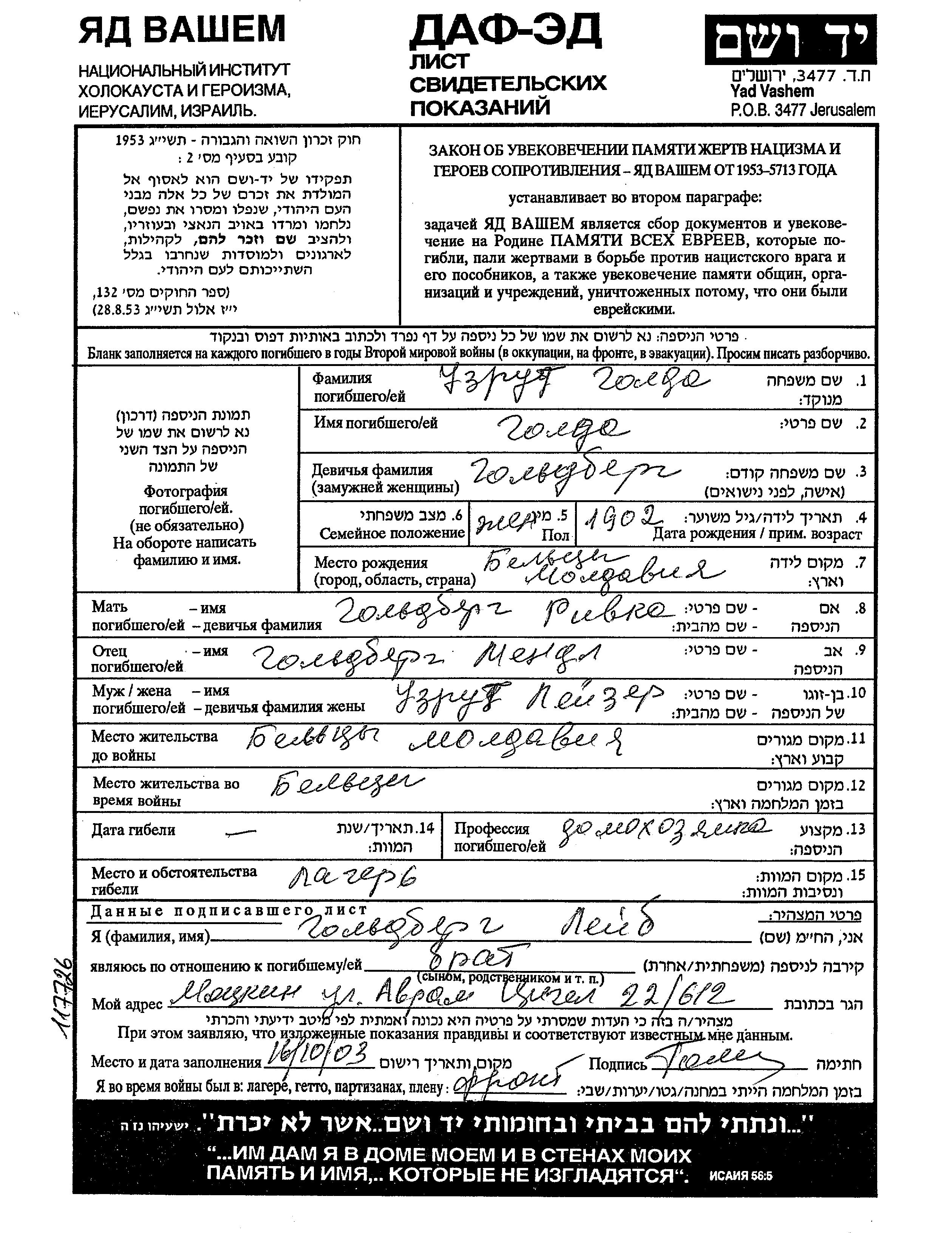 Yad Vashem - Pages of Testimony Names Memorial Collection