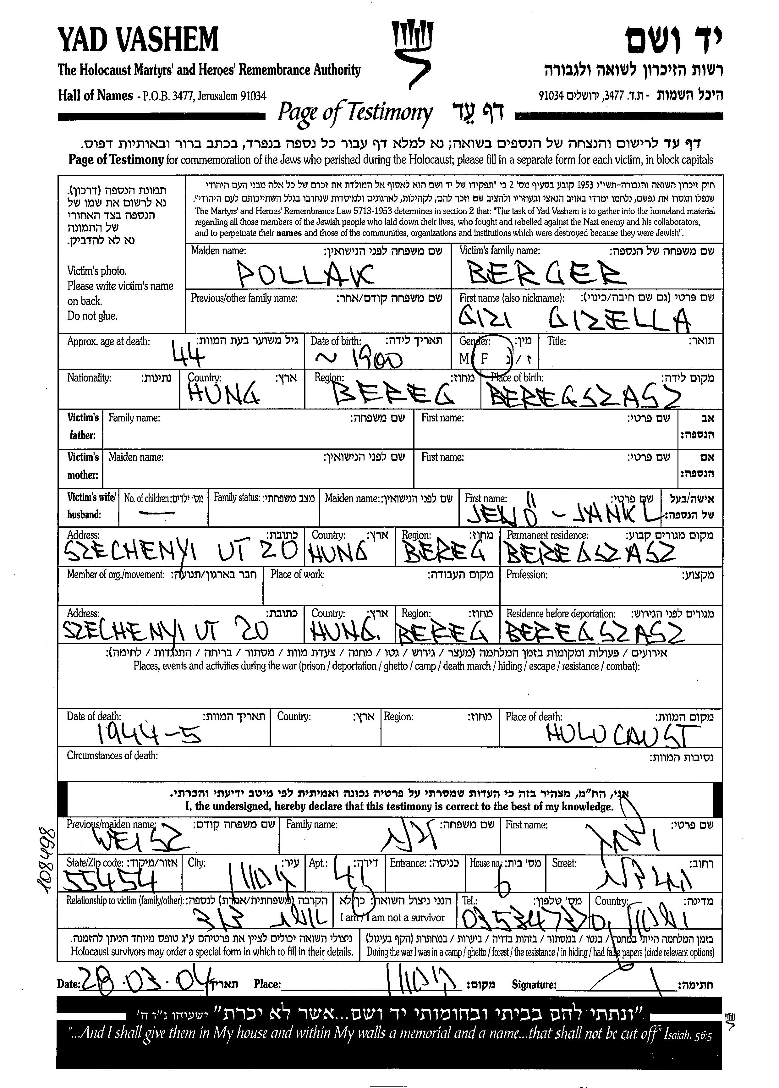Yad Vashem - Pages of Testimony Names Memorial Collection