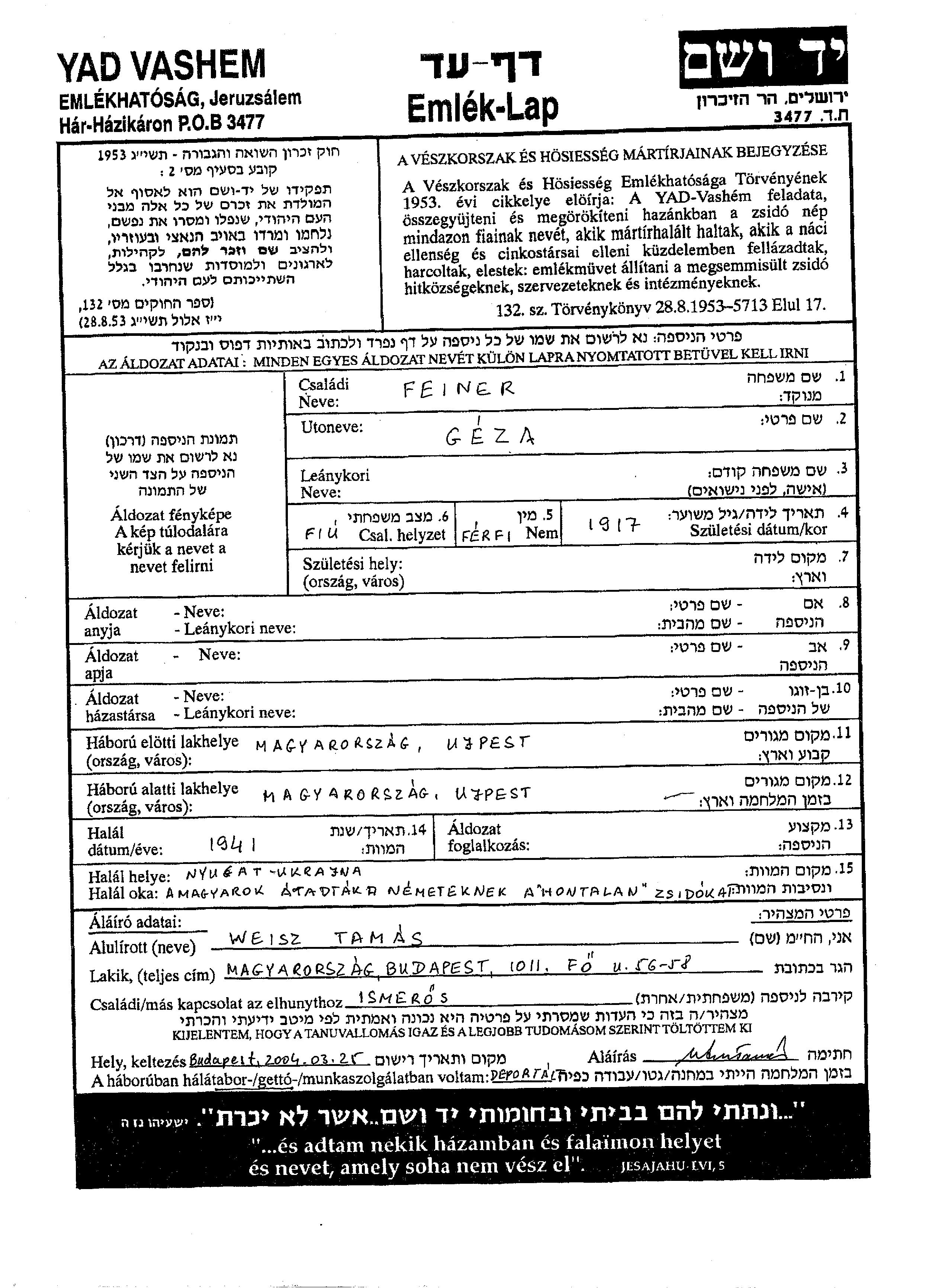 Geza a été assassiné pendant la Shoah. Lieu de la mort: Ukraine (URSS) en 1941.