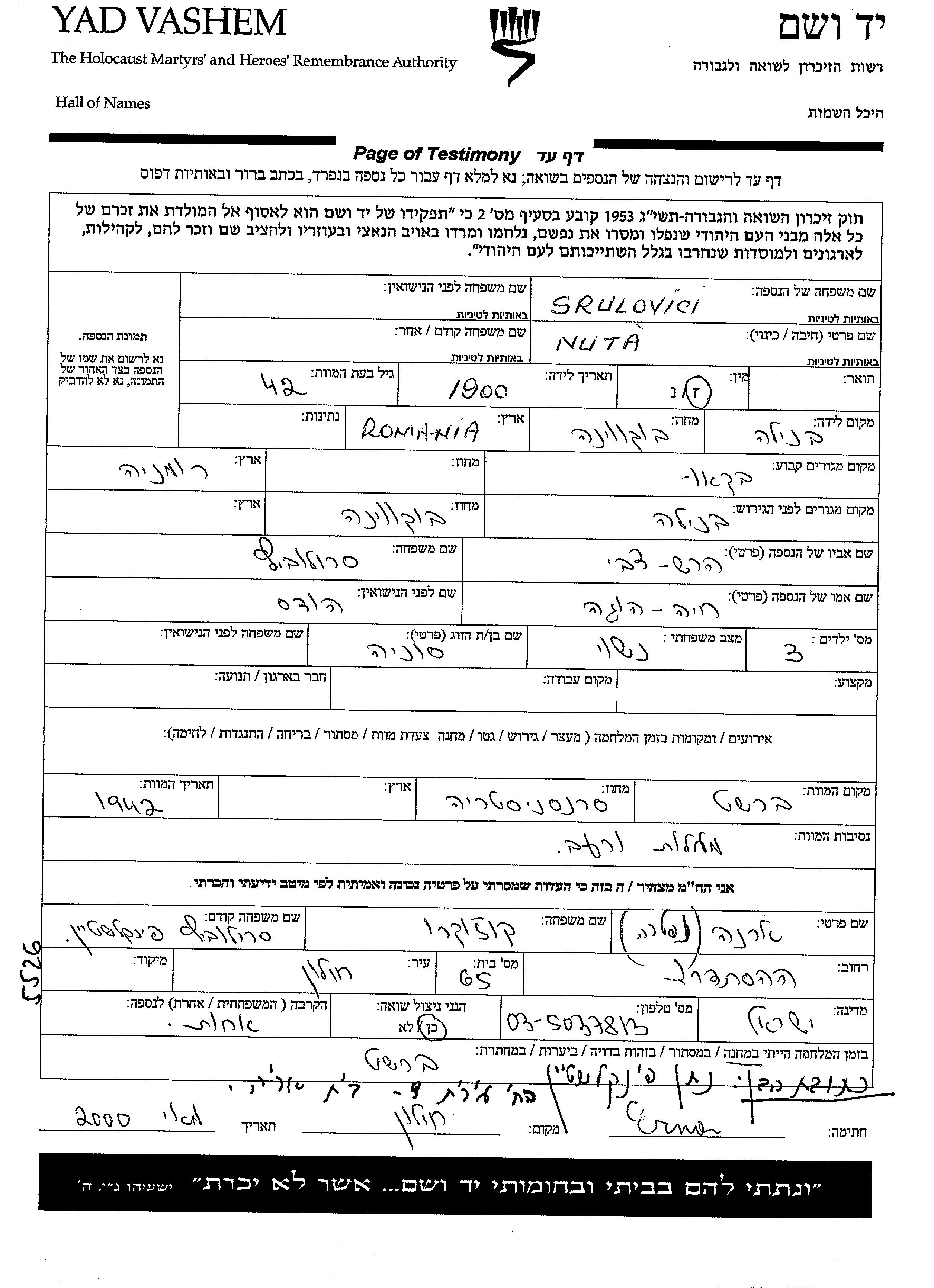 Nuta Srulovici est né à Banila, Roumanie en 1900, fils de Tzvi Hersh et de Hoga Khaia née Hodes. Il était Mariée à Sonia. Avant la seconde guerre mondiale il vivait à Bacau, Roumanie. Au cours de la guerre, il était à Banila, Roumanie.