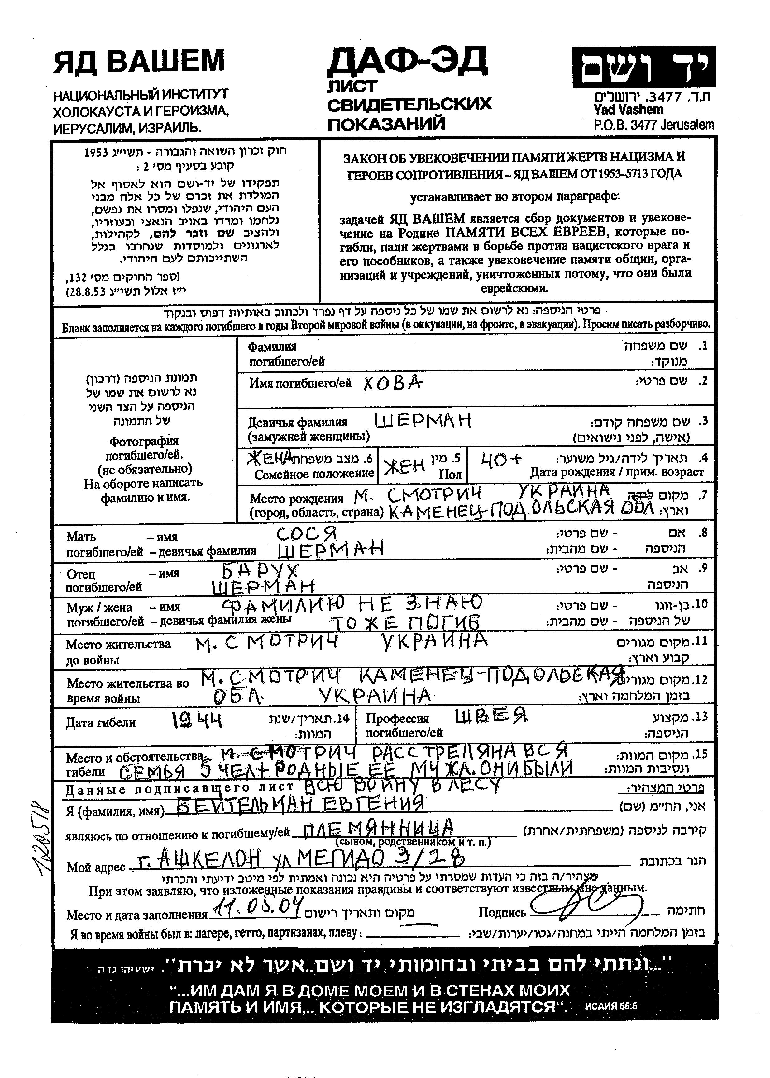 nom inconnu Khova 1904 Smotrich, Ukraine (URSS) Feuille de témoignage