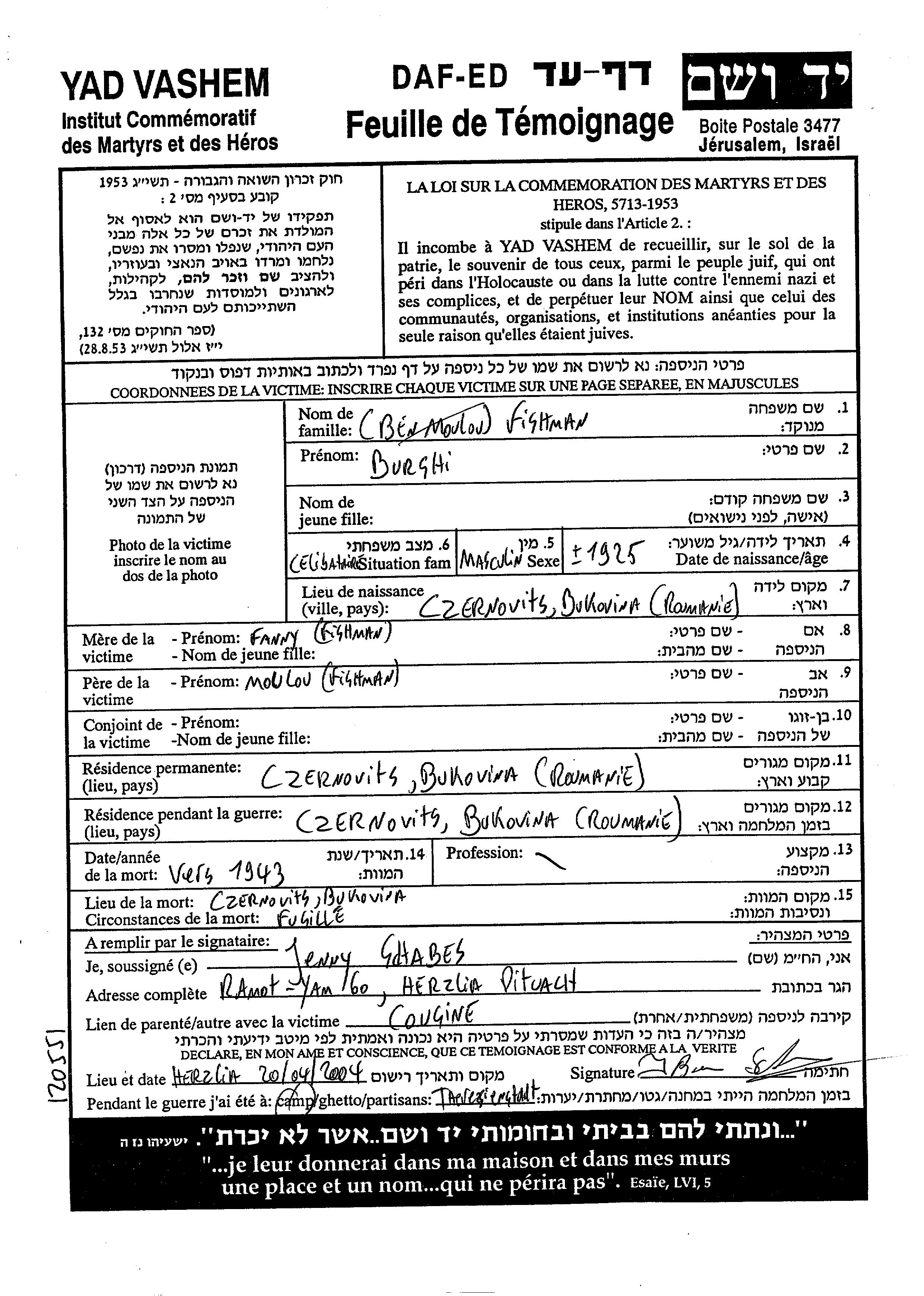 Fishman Burshi 1925 Czernovitz, Roumanie Feuille de témoignage