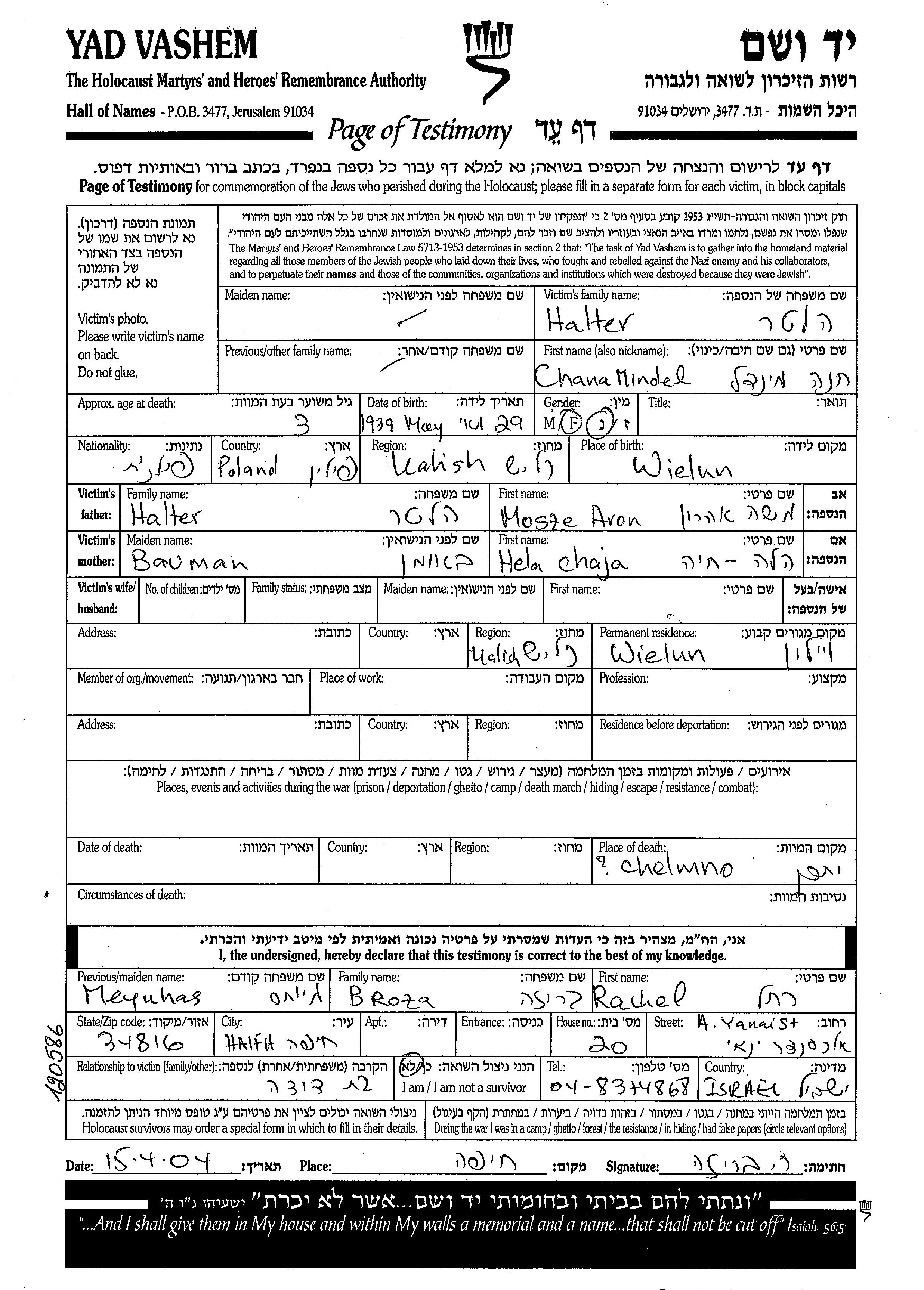 Halter Mindl Chana 1939 Wielun, Pologne Feuille de témoignage