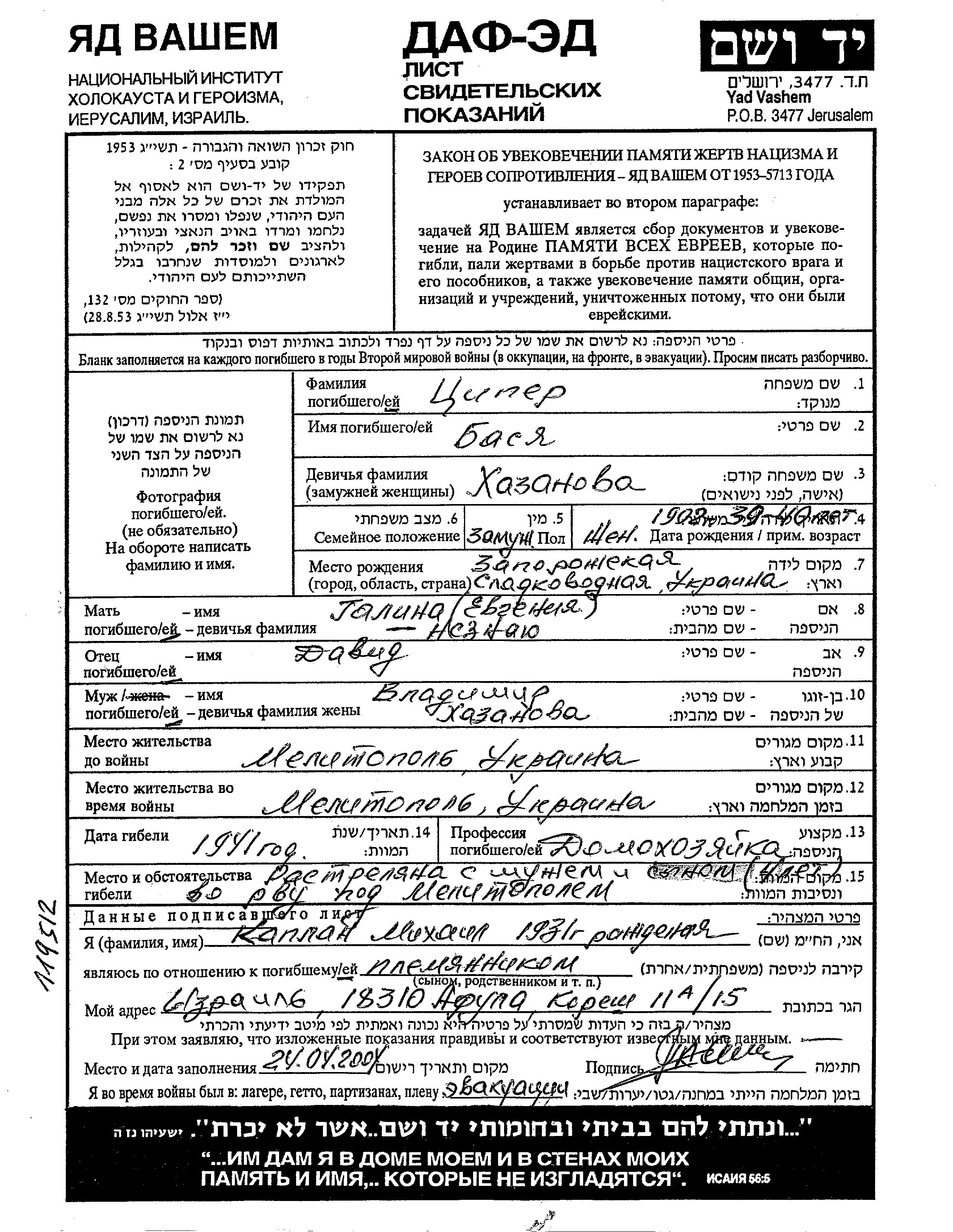 Basya Tziper née Khazanova est née à Sladkovodnaya, Ukraine (URSS) en 1902, fille de David et de Galina Yevgenia. Elle était Femme au foyer et Mariée à Vladimir. Avant la seconde guerre mondiale elle vivait à Melitopol, Ukraine (URSS). Pendant la guerre, elle était à Melitopol, Ukraine (URSS).
