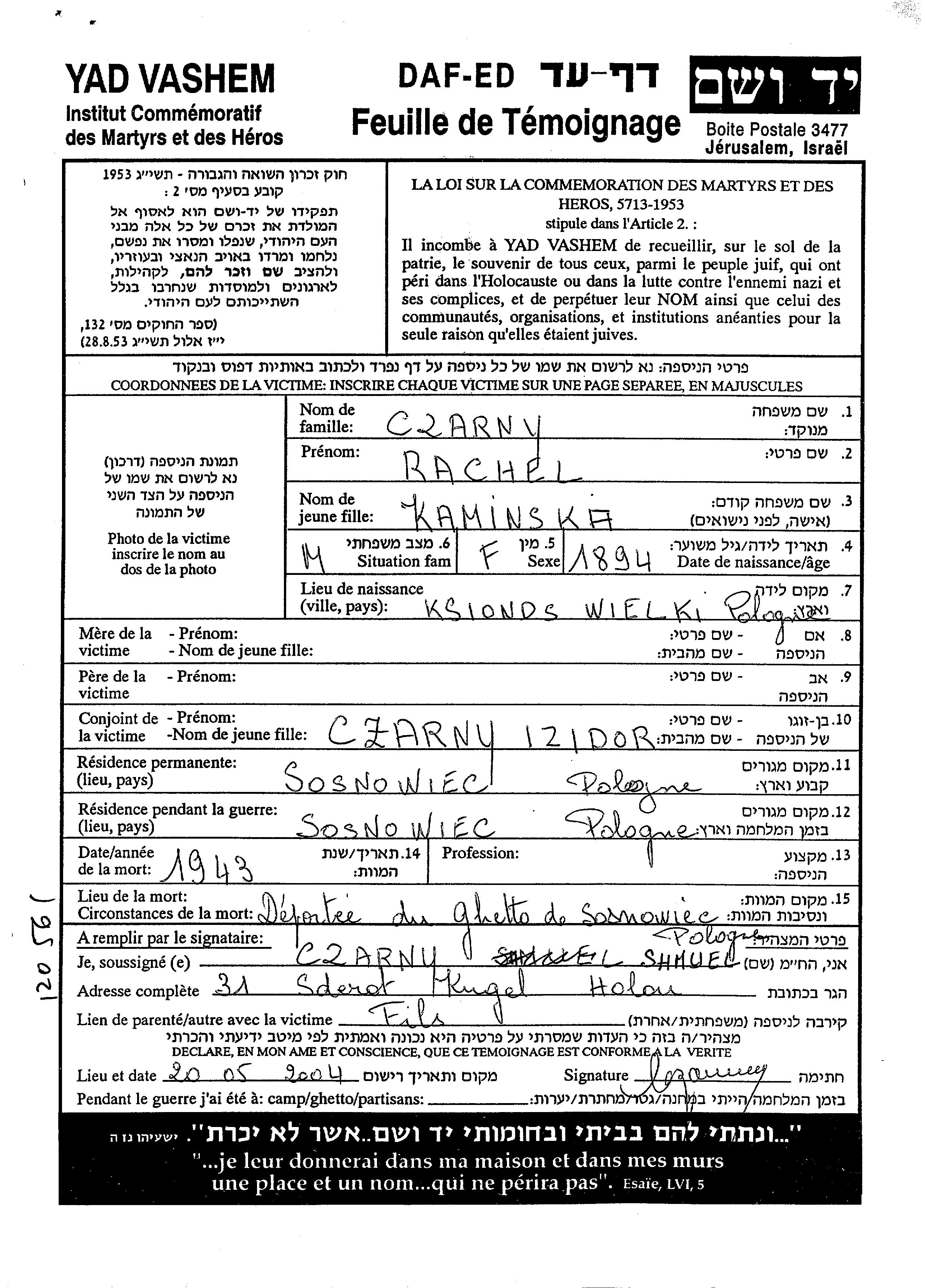 Czarny Rachel 1894 Sosnowiec, Pologne Feuille de témoignage
