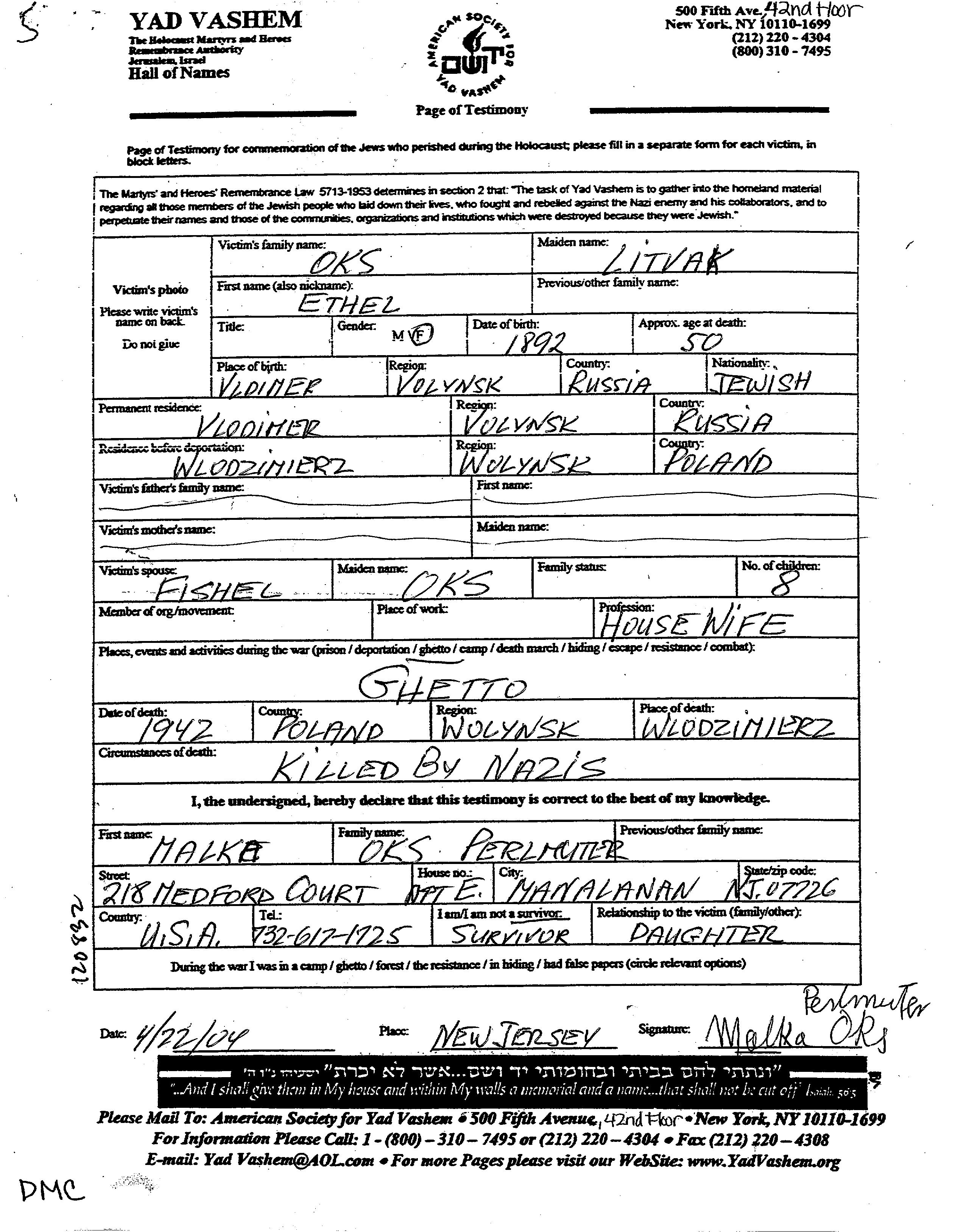Ethel a été assassinée pendant la Shoah. Lieu de la mort: Wlodzimierz Wolynski, Pologne en 1942.