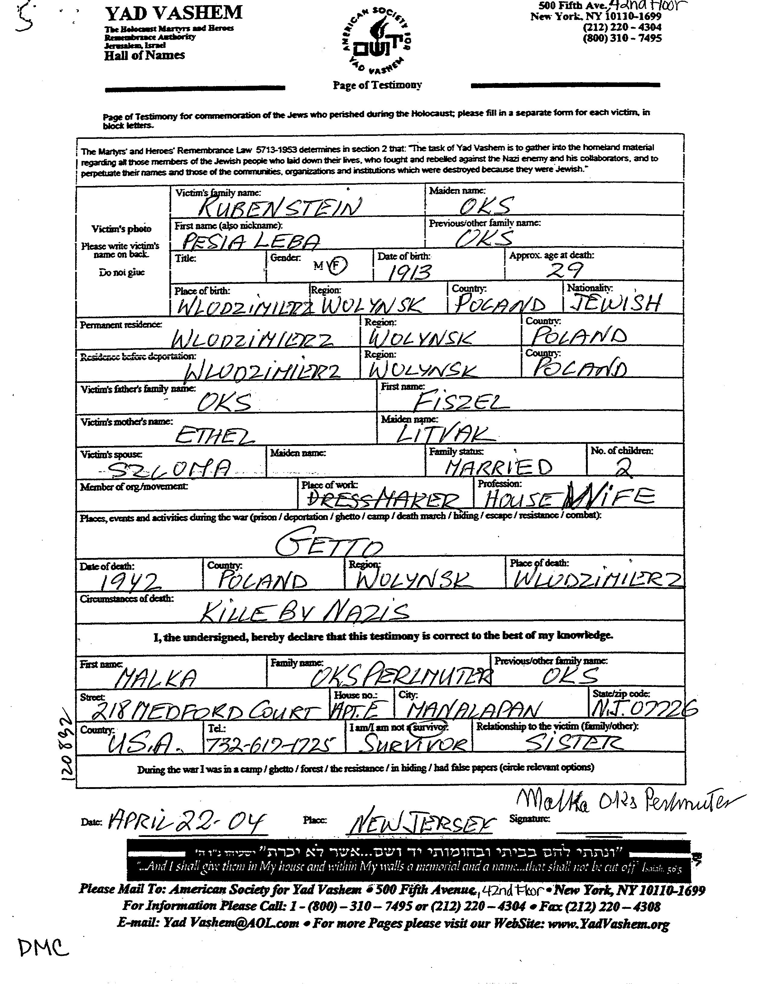 Pesia Leba Rubenstein née Oks est née à Wlodzimierz Wolynski, Pologne en 1913, fille de Fiszel et de Ethel née Litvak. Elle était Couturière et Mariée à Szloma. Avant la seconde guerre mondiale elle vivait à Wlodzimierz, Pologne. Pendant la guerre, elle était à Wlodzimierz, Pologne.