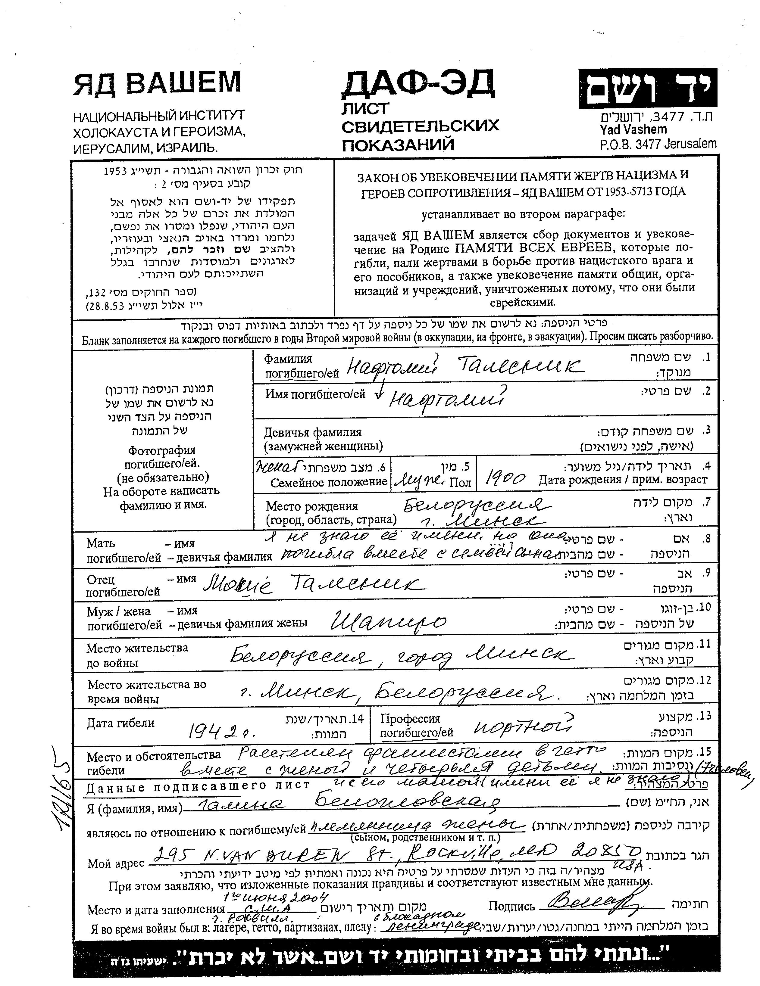Galesnik Naftoli 1900 Minsk, Bélorussie (URSS) Feuille de témoignage