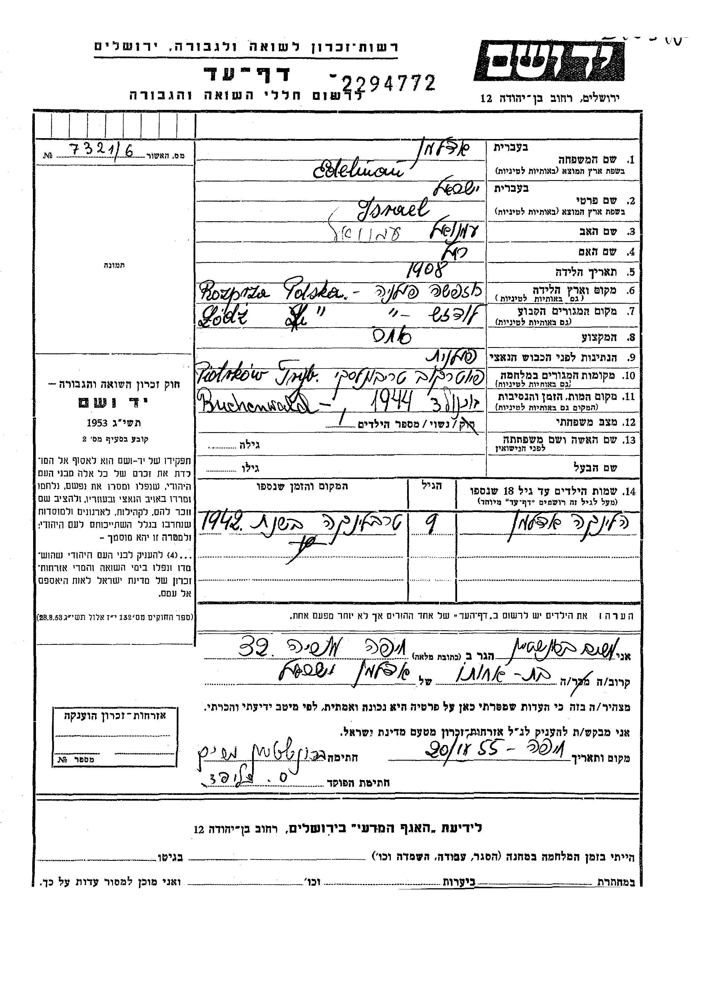 Edelman Israel 1908 Lodz, Pologne Feuille de témoignage