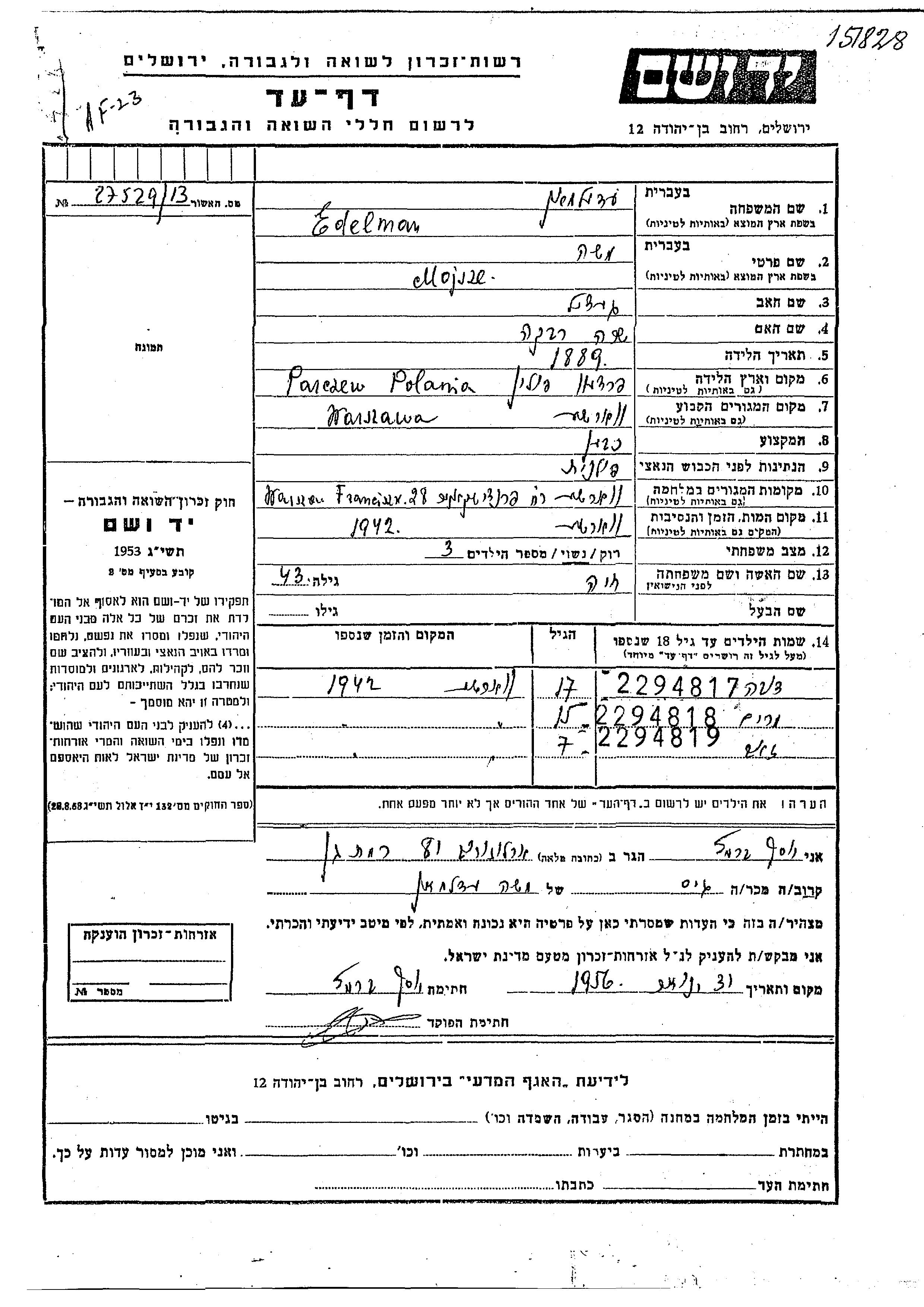 Edelman Dora 1925 Warszawa, Pologne Feuille de témoignage