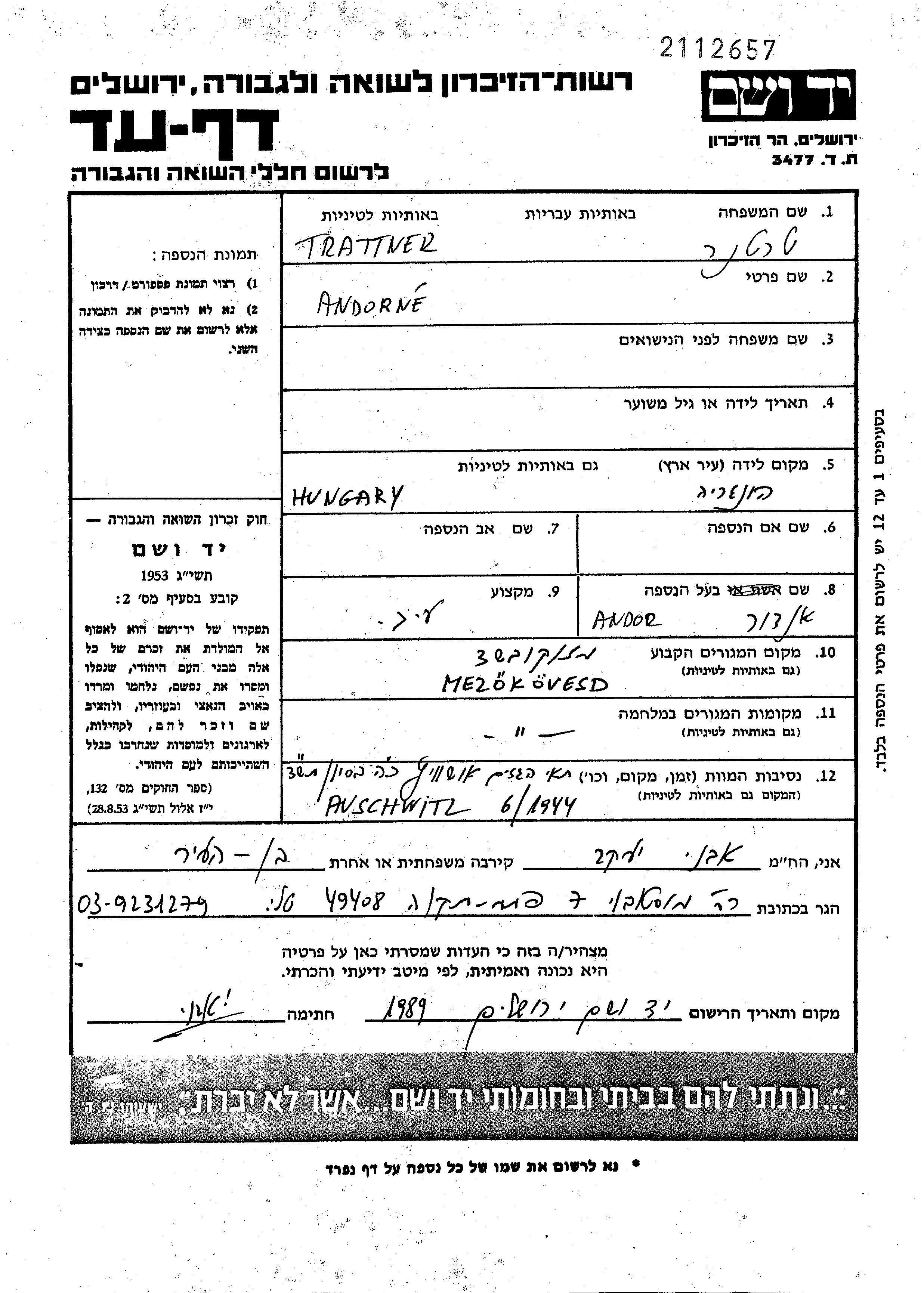 Tratner prénom inconnu Mezokovesd, Hongrie Feuille de témoignage