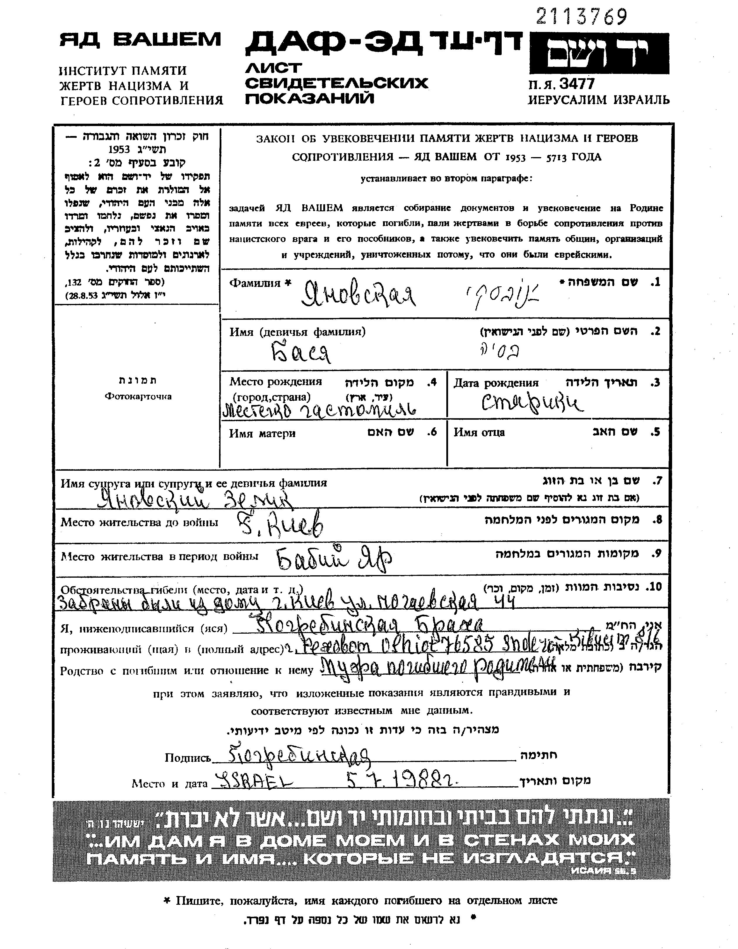 Yanovskaya Basya Kiev, Ukraine (URSS) Feuille de témoignage