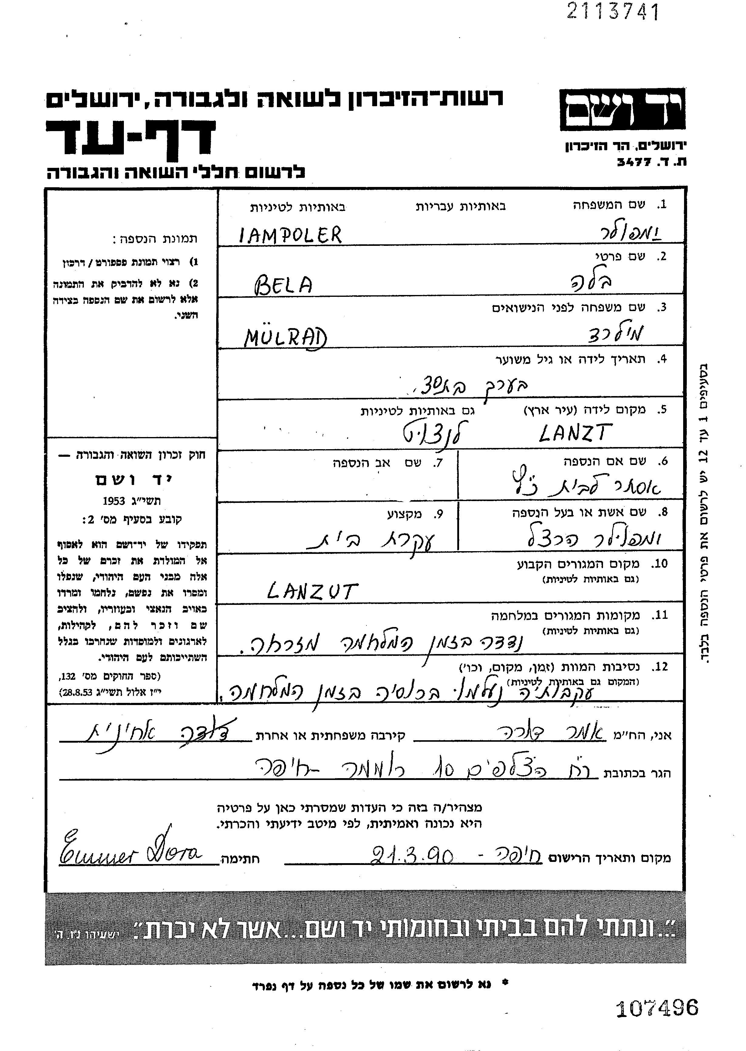 Bela Iampoler née Milrad est née à Lanzut, Pologne, fille de Ester née Katz. Elle était Femme au foyer. Avant la seconde guerre mondiale elle vivait à Lanzut, Pologne.