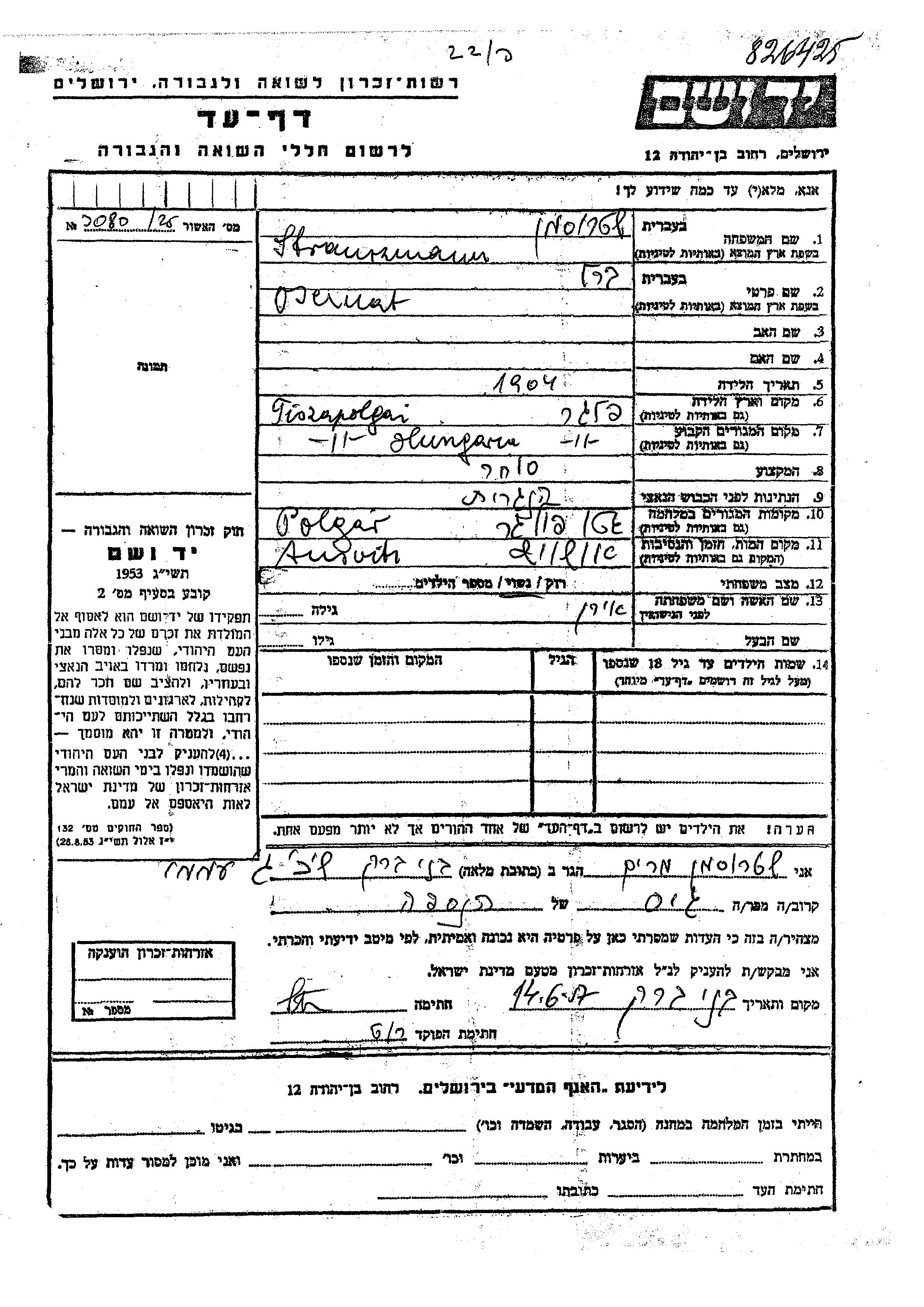 Yad Vashem - Pages of Testimony Names Memorial Collection