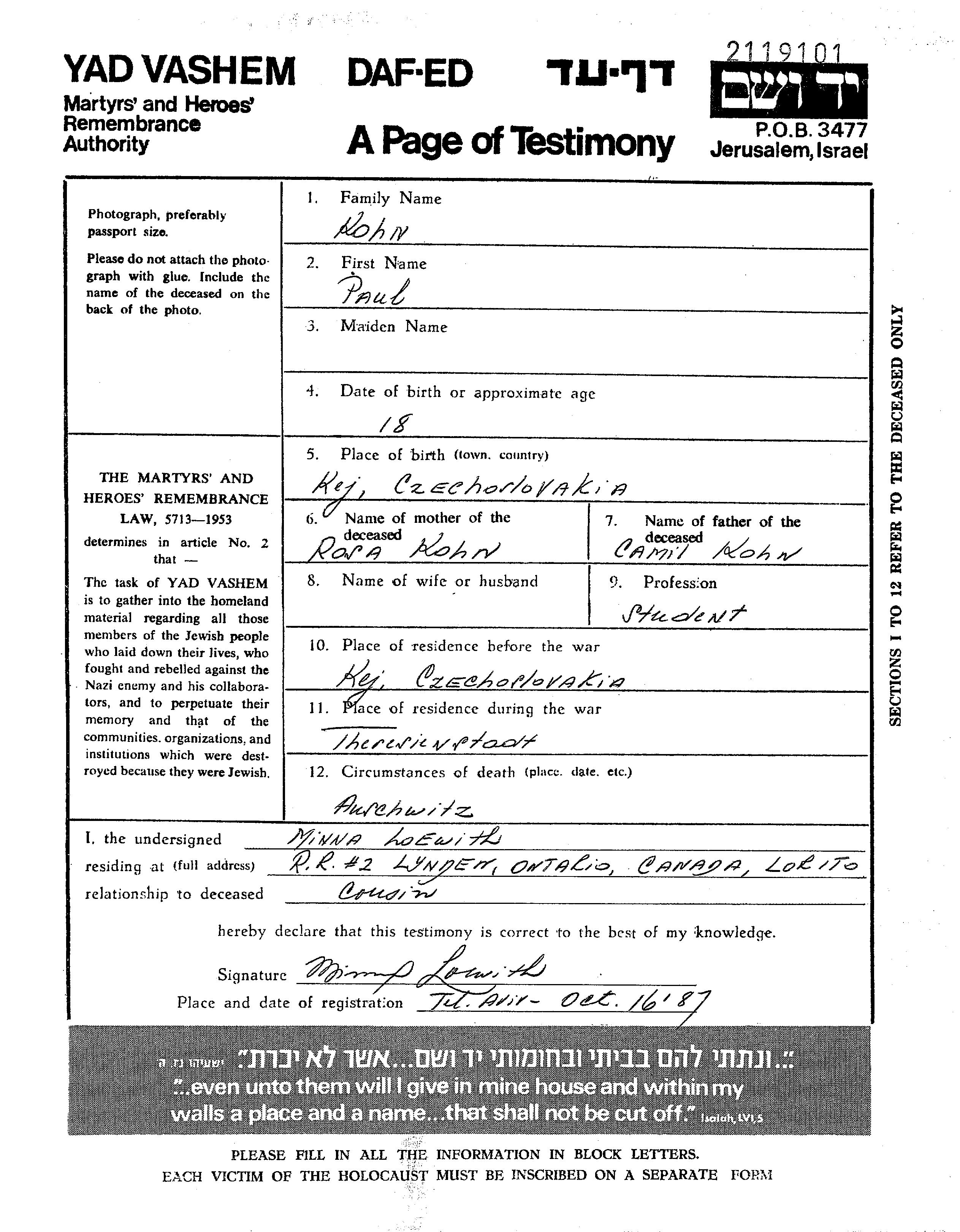 Kohn Paul Kej, Tchécoslovaquie Feuille de témoignage