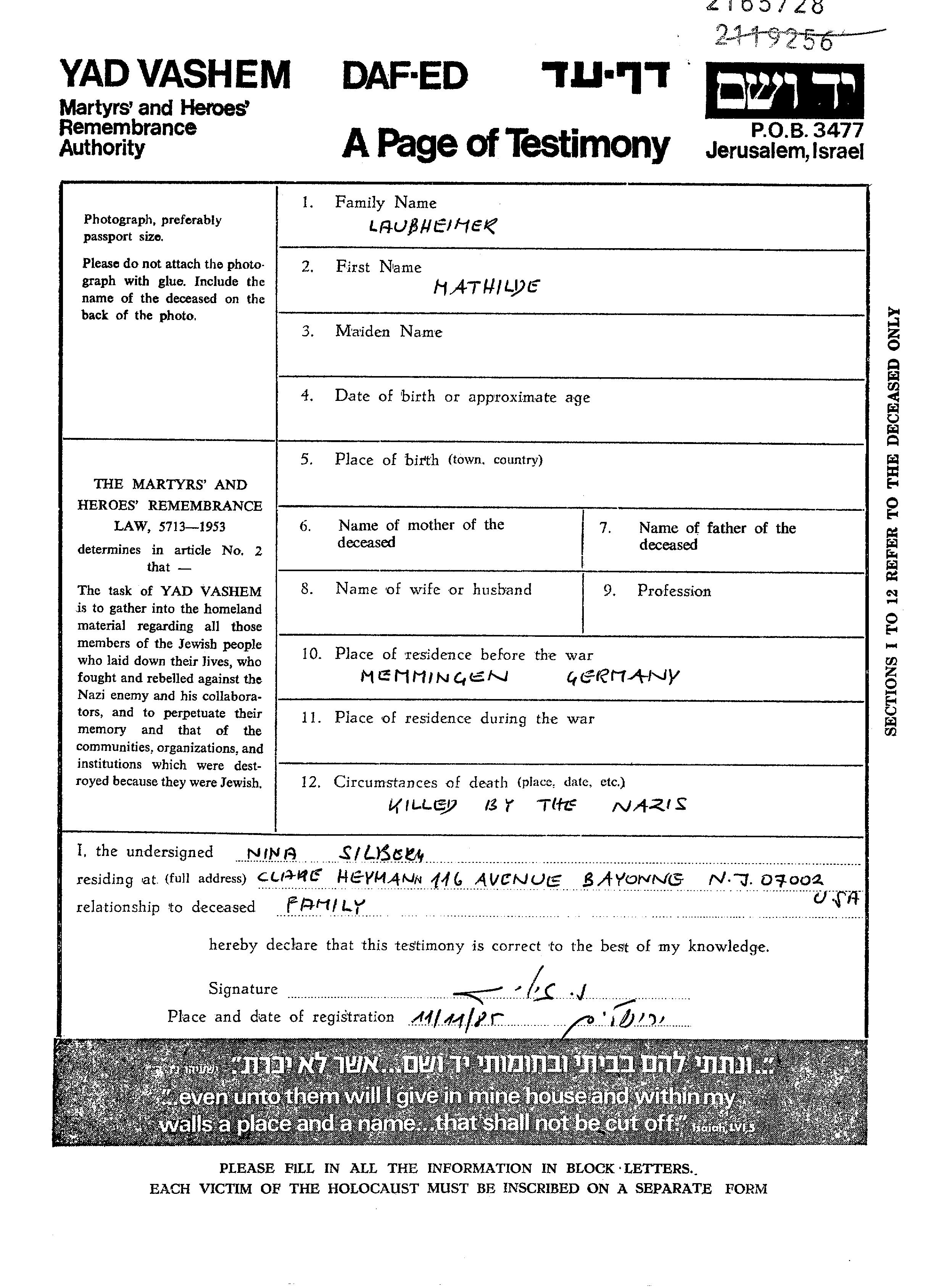 Mathilde Laubheimer. Avant la seconde guerre mondiale elle vivait à Memmingen, Allemagne. Pendant la guerre, elle était à Memmingen, Allemagne.