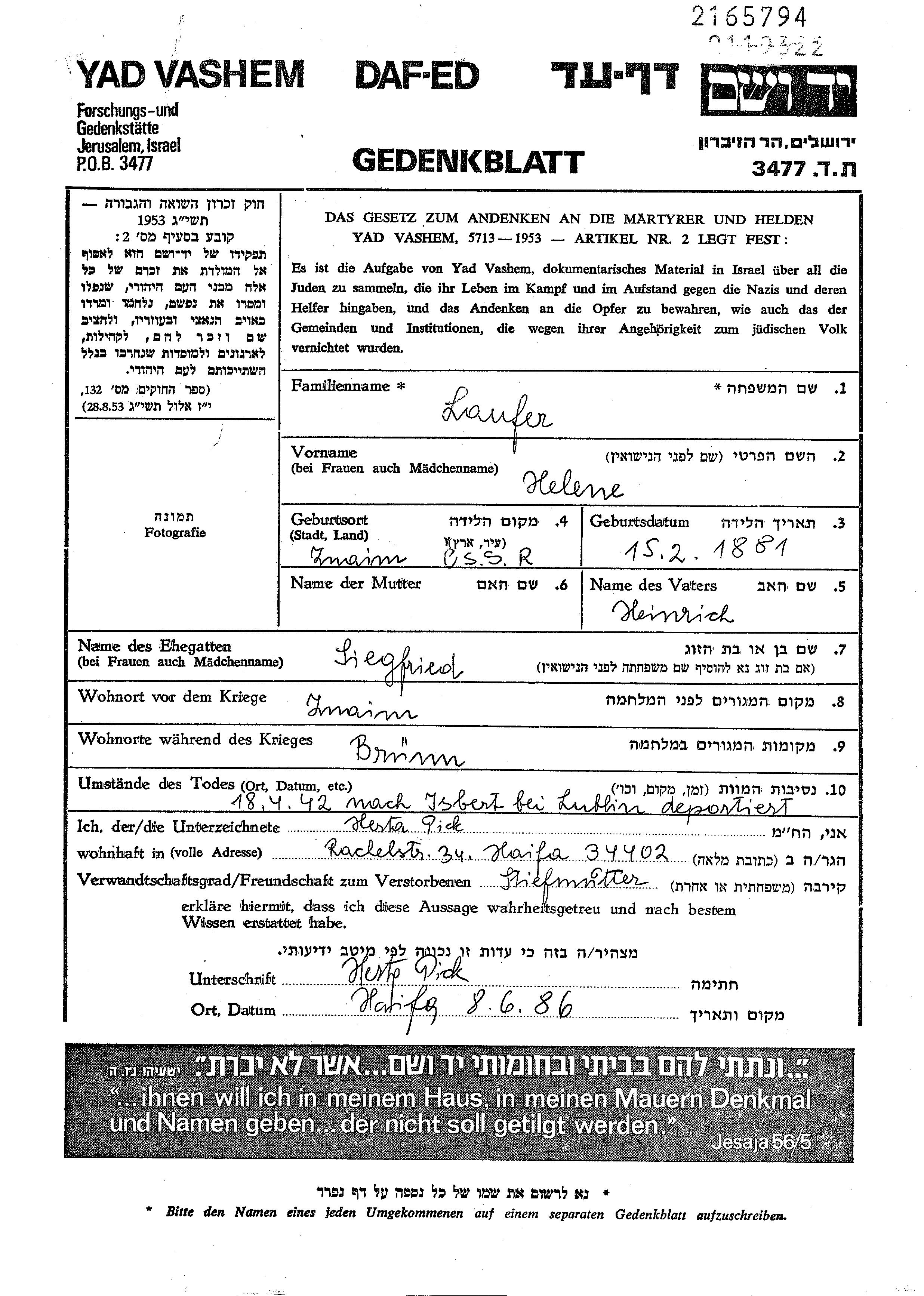 Laufer Helene 1881 Znaim, Tchécoslovaquie Feuille de témoignage