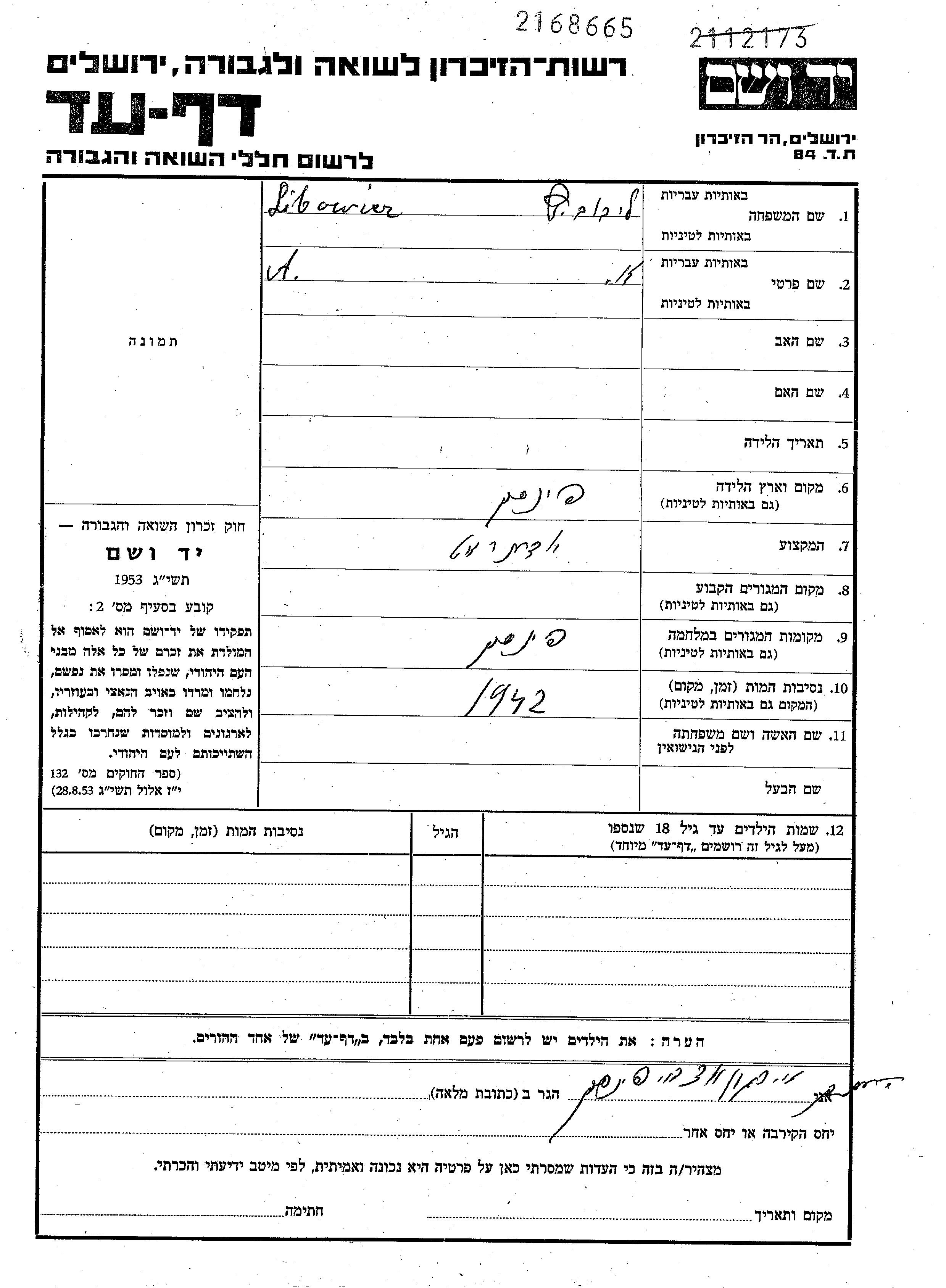 Libowicz prénom inconnu Pinsk, Pologne Feuille de témoignage