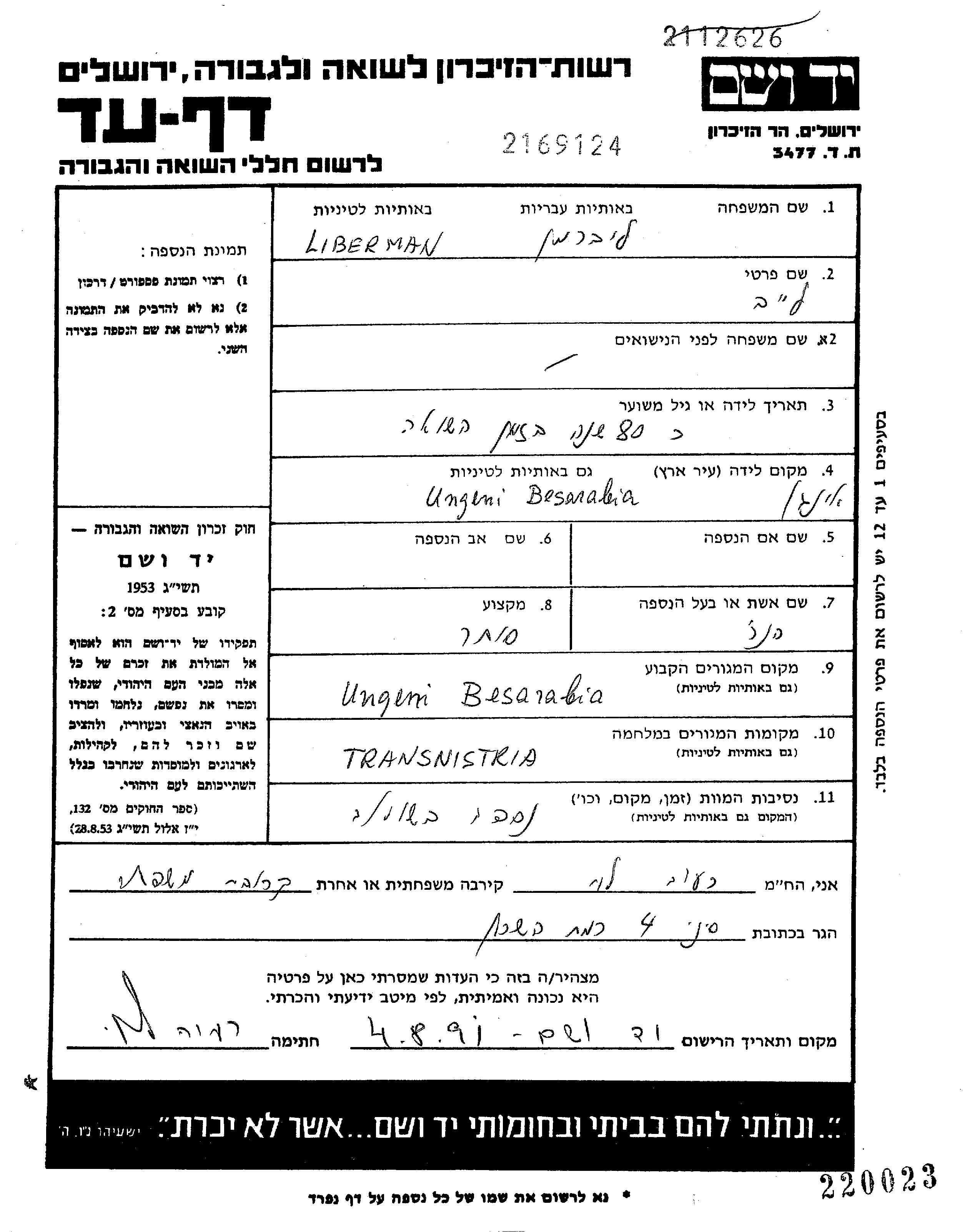 Liberman Leib Ungeni, Roumanie Feuille de témoignage