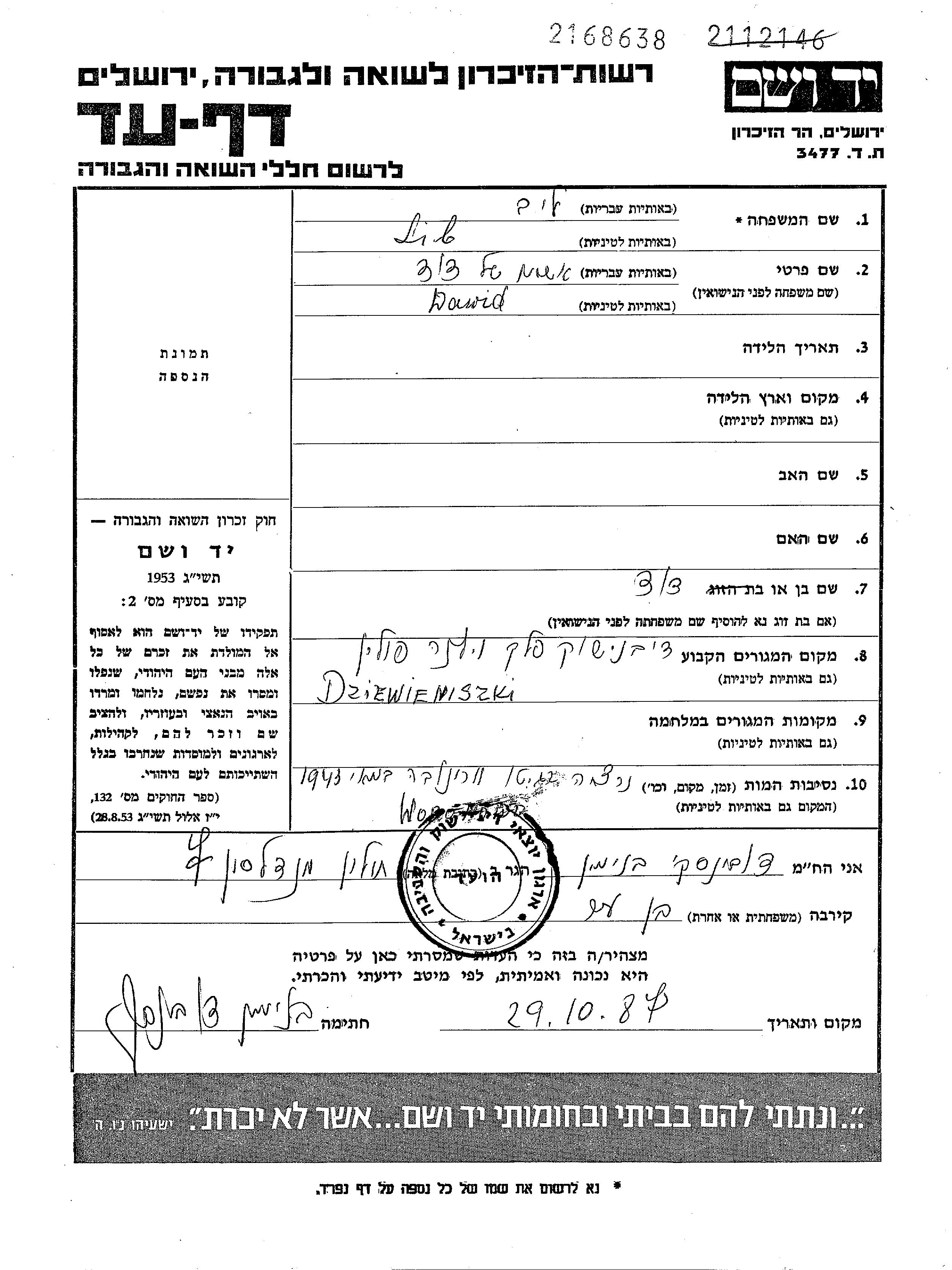 Leib Lib prénom inconnu Dziewieniszki, Pologne Feuille de témoignage