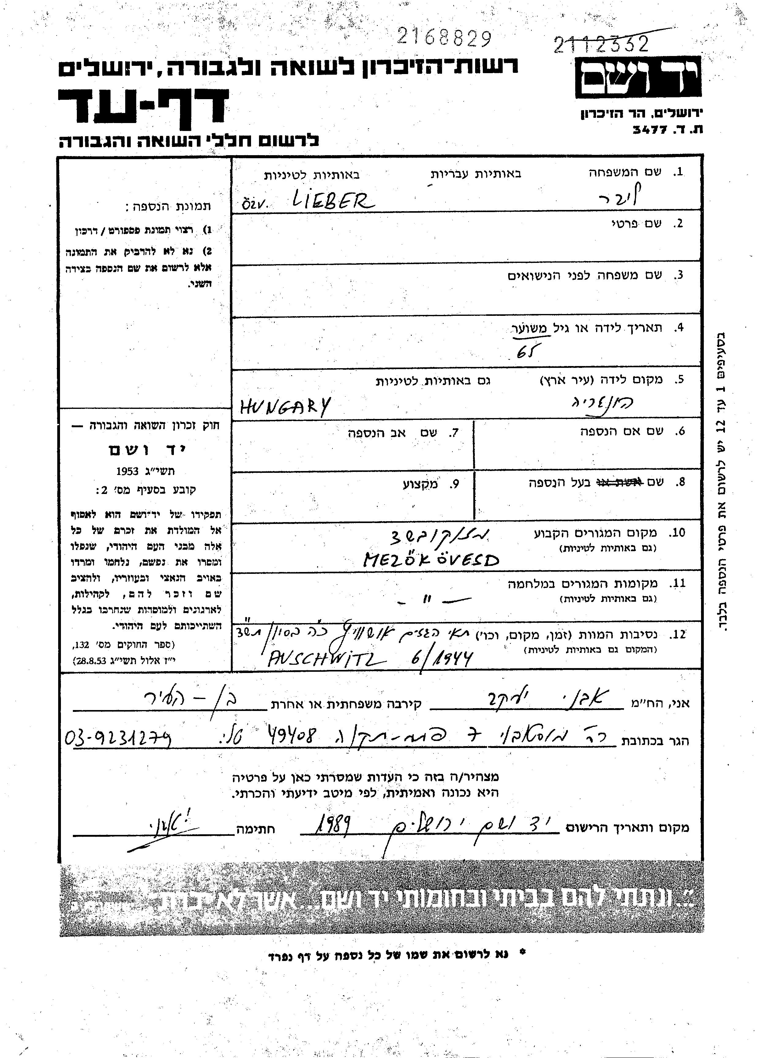 prénom inconnu Liber Lieber est née à Hongrie en 1879. Elle était veuve. Avant la seconde guerre mondiale elle vivait à Mezokovesd, Hongrie. Pendant la guerre, elle était à Mezokovesd, Hongrie.