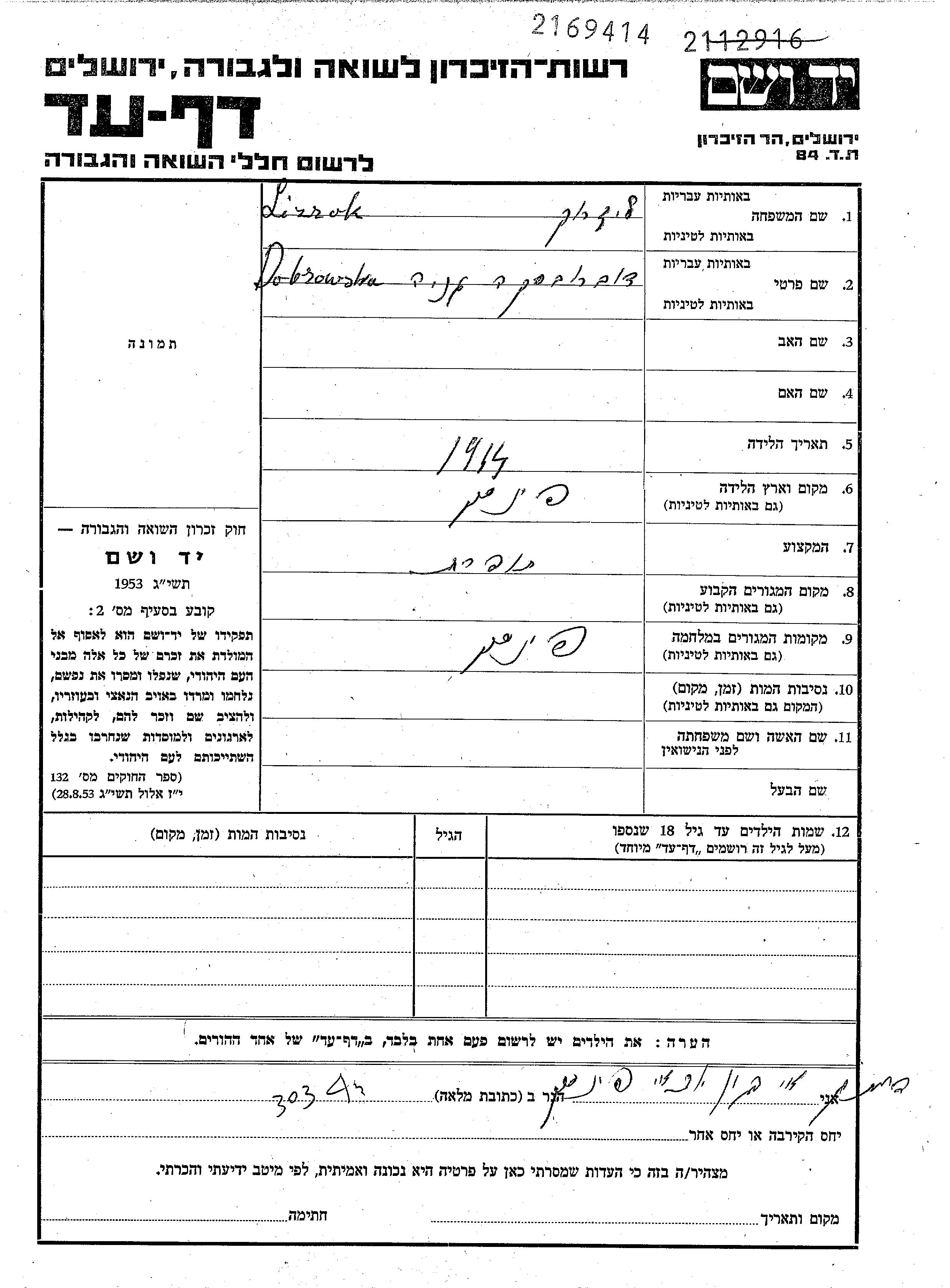 Lajzeruk Genya 1914 Pinsk, Pologne Feuille de témoignage