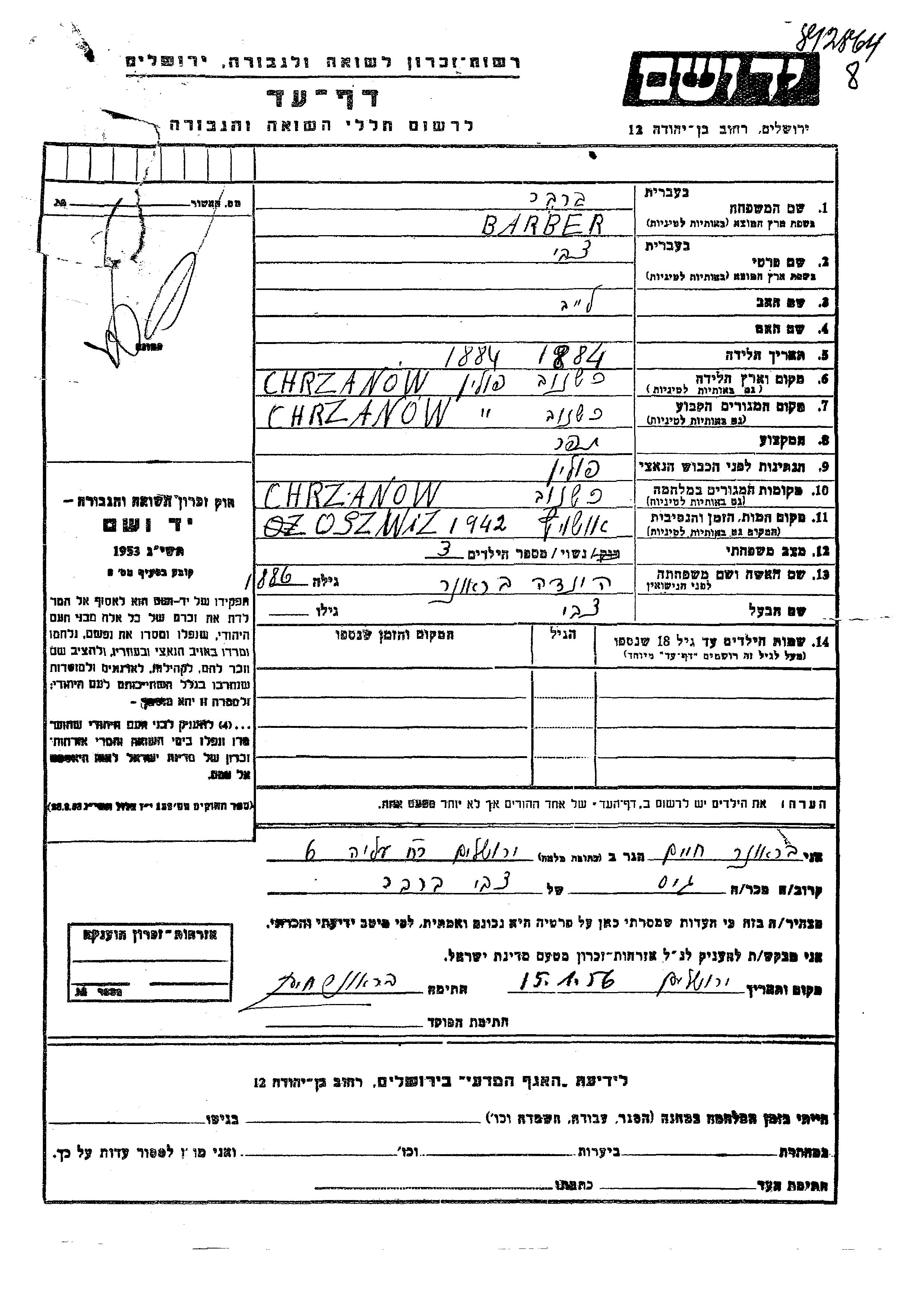 Tzvi Barber est né à Chrzanow, Pologne en 1884, fils de Leib. Il était Tailleur et Mariée à Hinda née Brauner. Avant la seconde guerre mondiale il vivait à Chrzanow, Pologne. Au cours de la guerre, il était à Chrzanow, Pologne.
