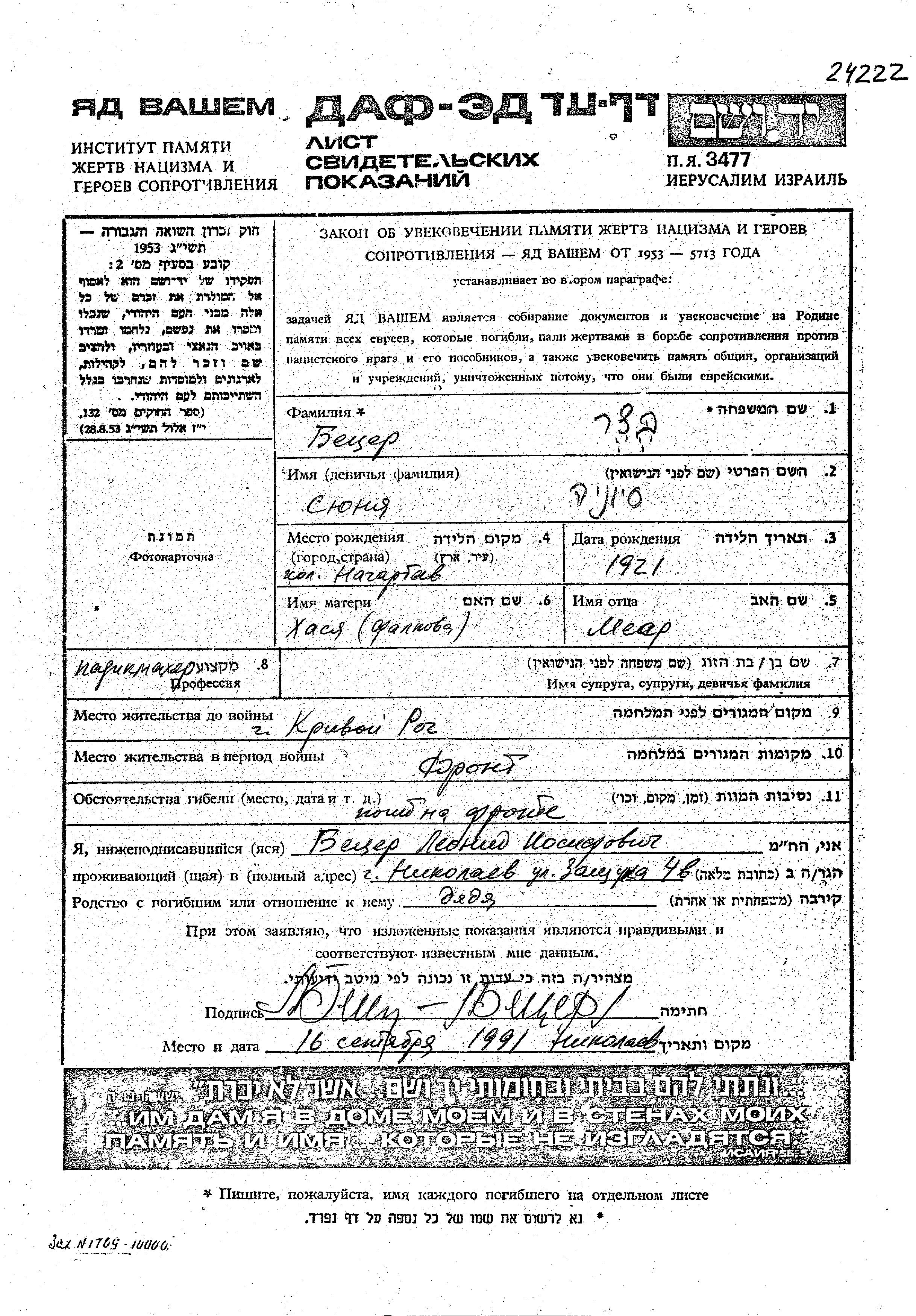 Syunya Betzer est né à Nagartav, Ukraine (URSS) en 1921, fils de Meyer et de Khasya née Falkova. Avant la seconde guerre mondiale il vivait à Krivoy Rog, Ukraine (URSS). Au cours de la guerre, il était à the Soviet armed forces. Syunya a été tué en tant que militaire pendant la Seconde Guerre mondiale. Lieu de la mort: the Soviet armed forces.
