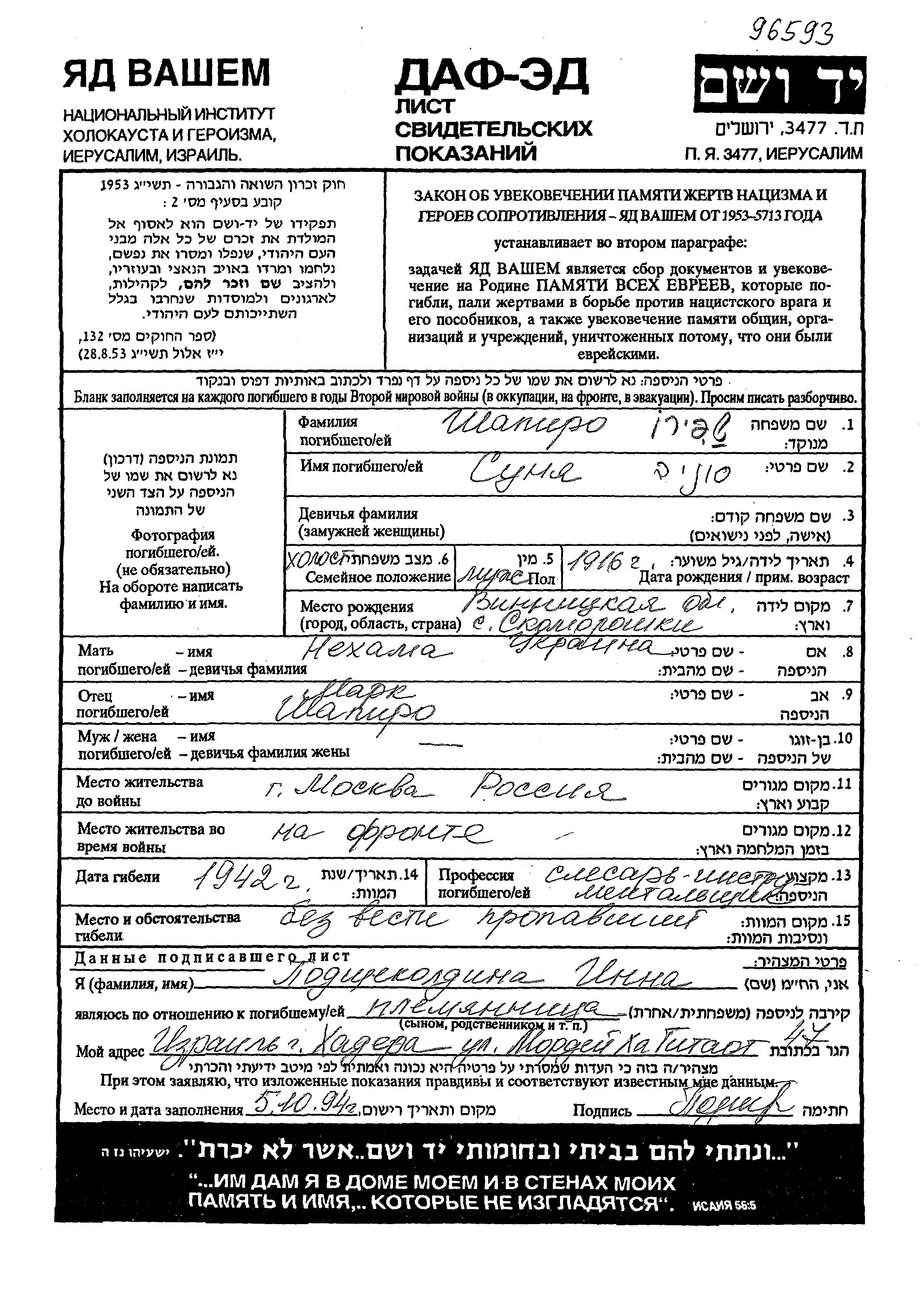 Shapiro Sunya Sonia 1916 Moskva, Russie (URSS) Feuille de témoignage