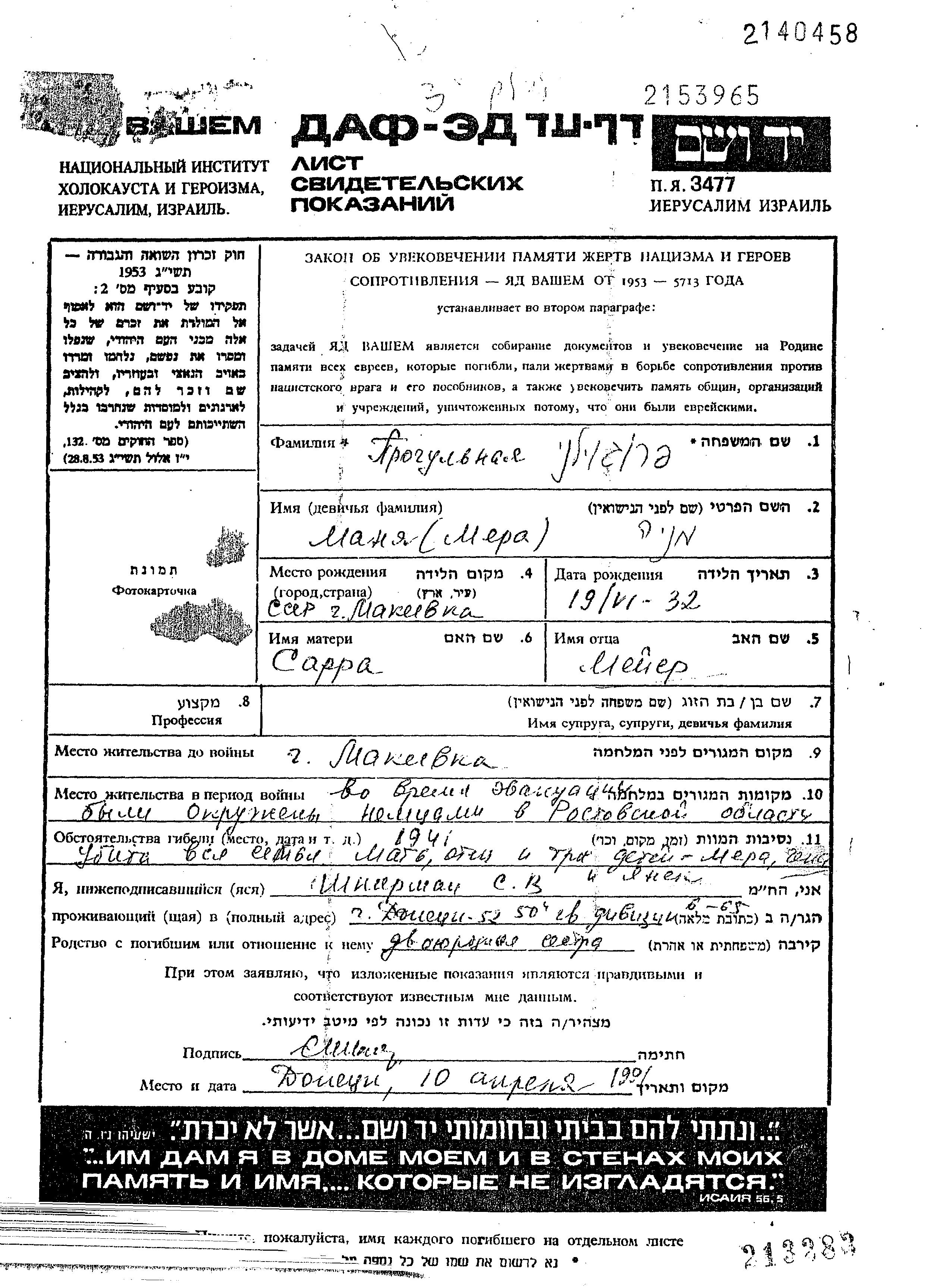 Progulnaya prénom inconnu 1932 Makeyevka, Ukraine (URSS) Feuille de témoignage