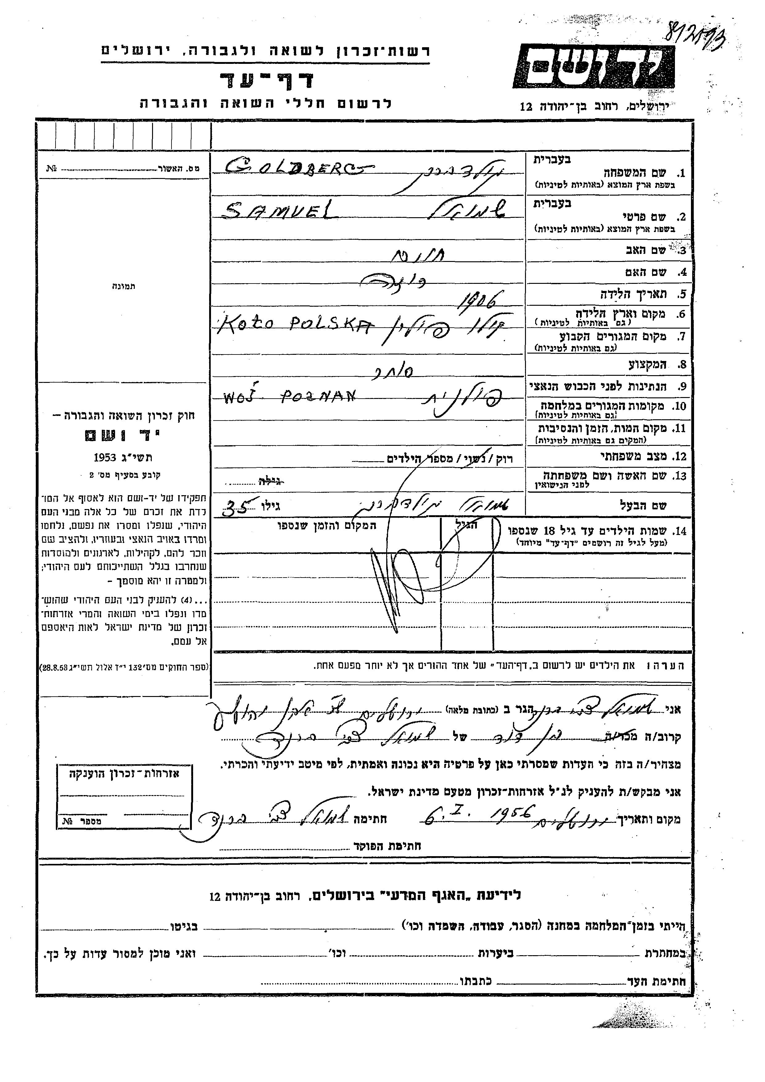 Goldberg Shmuel 1906 endroit inconnu, Feuille de témoignage