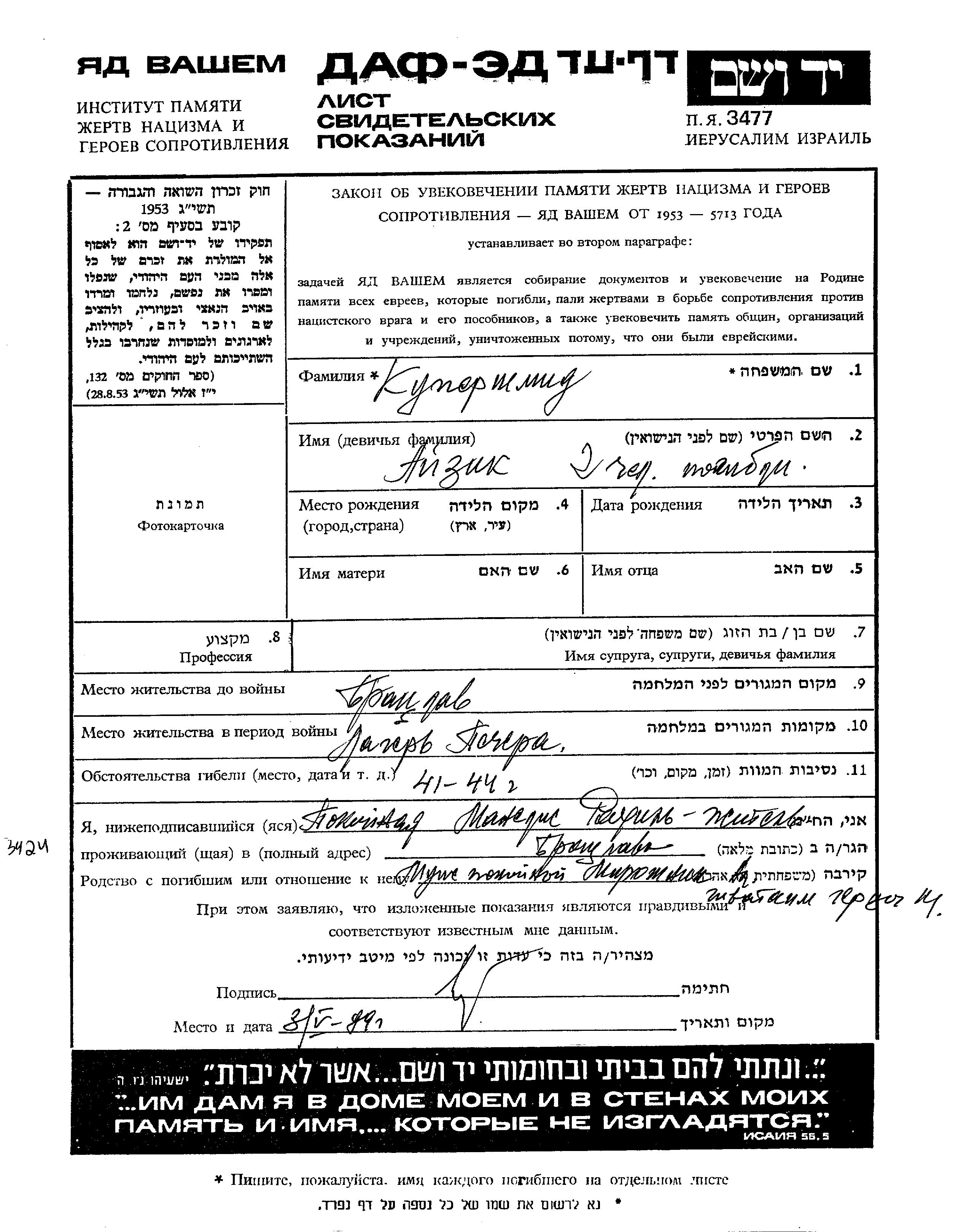 Kupershmid Aizik Bratzlav, Ukraine (URSS) Feuille de témoignage