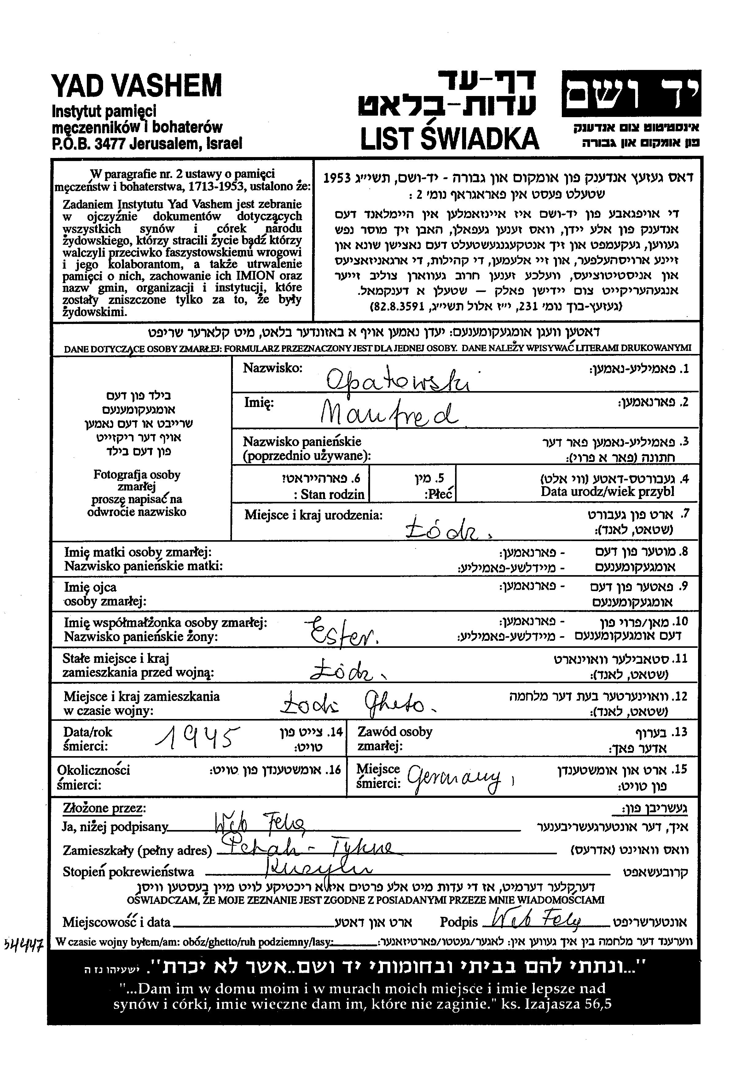 Opatowski Manfred Lodz, Pologne Feuille de témoignage