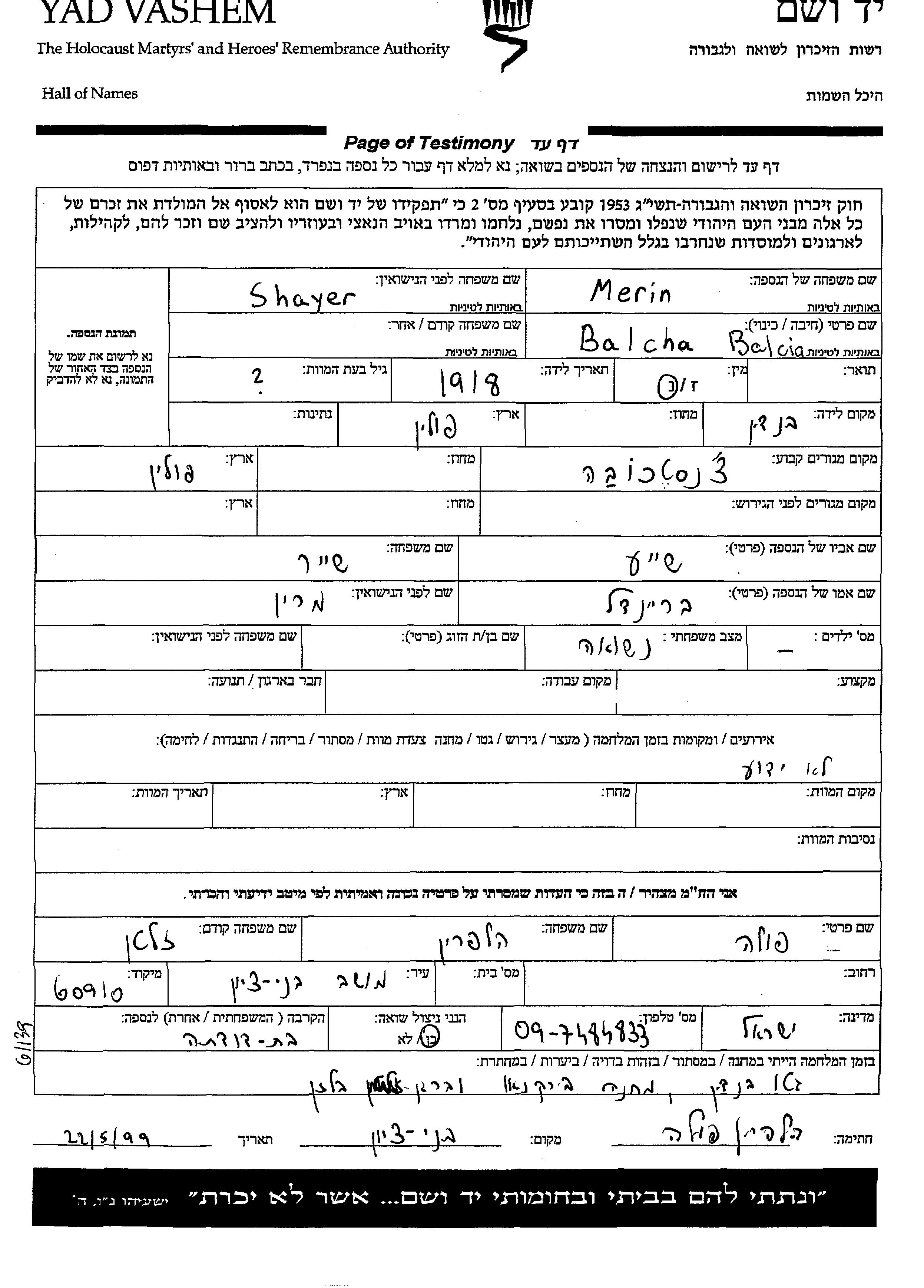 Balcha Merin née Shayer est née à Bendin, Pologne en 1918, fille de Shiye et de Braindel née Marin. Elle était Mariée. Avant la seconde guerre mondiale elle vivait à Chenstchov, Pologne. Pendant la guerre, elle était à Chenstchov, Pologne.