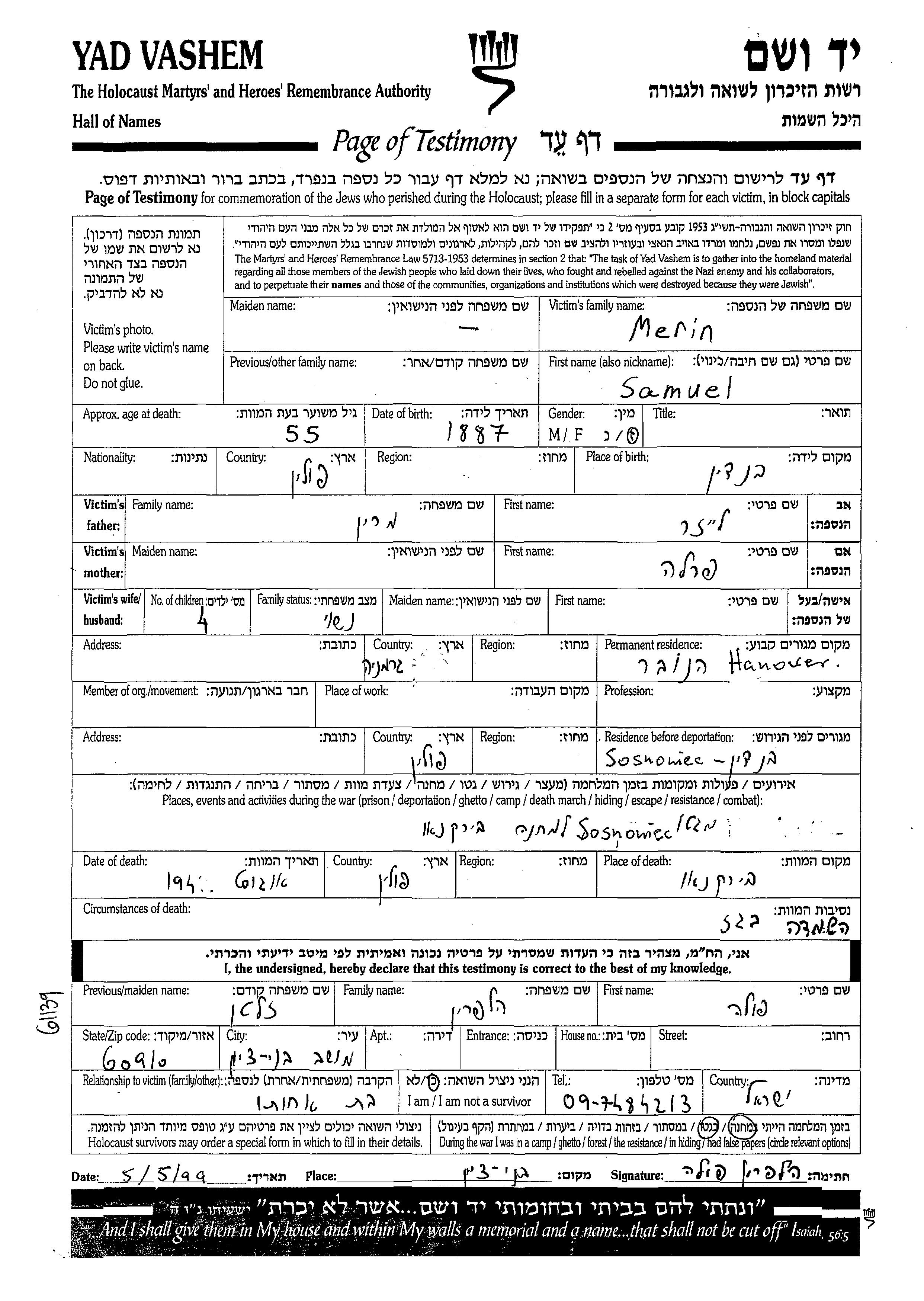 Samuel Merin est né à Bendin, Pologne en 1887, fils de Leizer et de Perla. Avant la seconde guerre mondiale il vivait à Hanover, Allemagne. Au cours de la guerre, il était à Sosnowiec, Pologne.