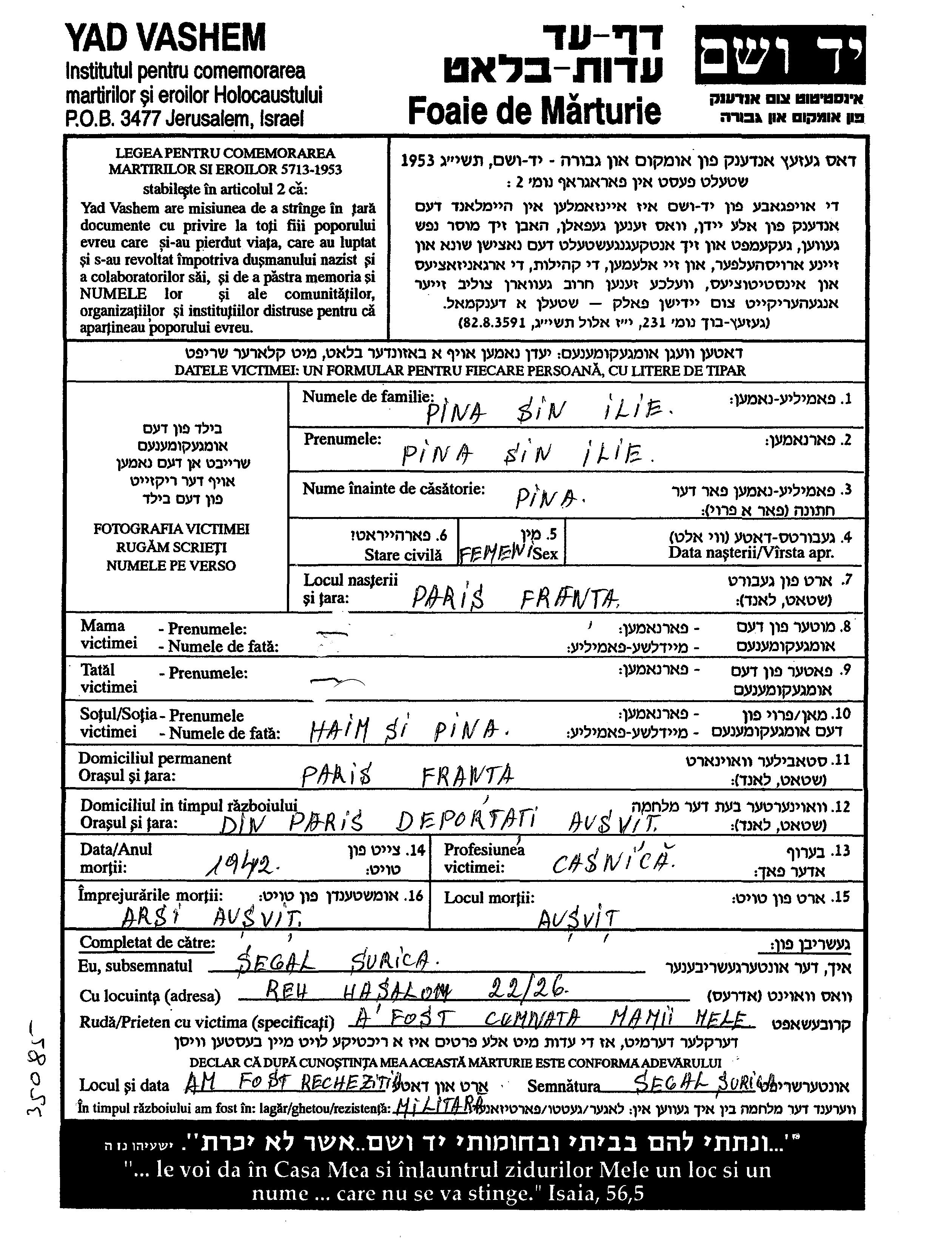 Sin Ilie Pina Paris, France Feuille de témoignage