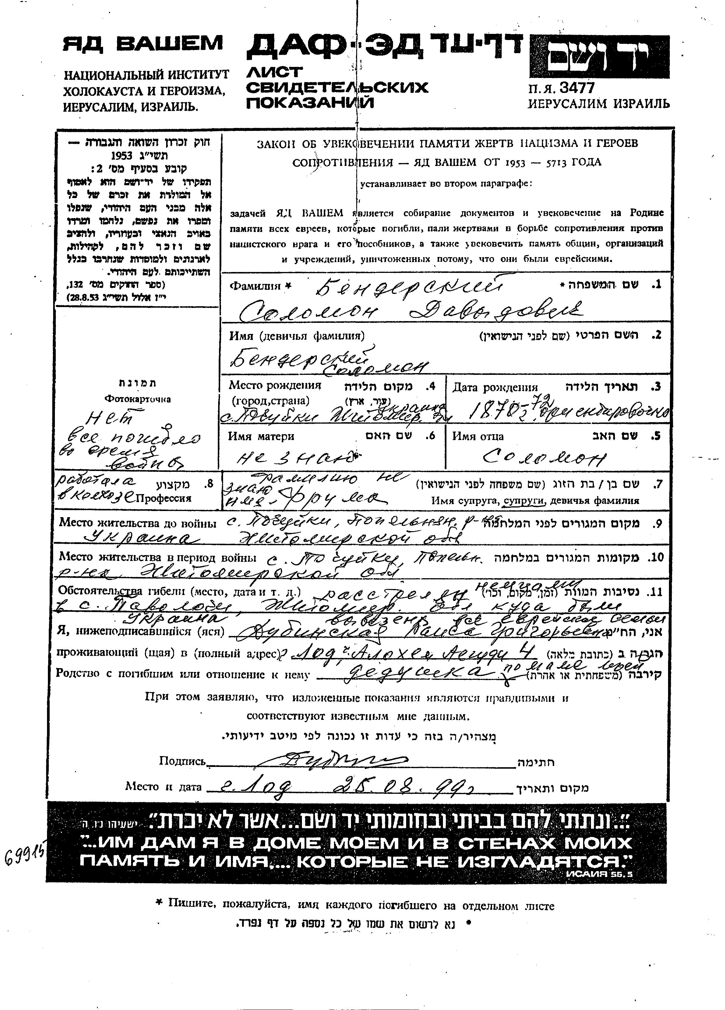 Benderski Solomon 1870 Pochuiki, Ukraine (URSS) Feuille de témoignage