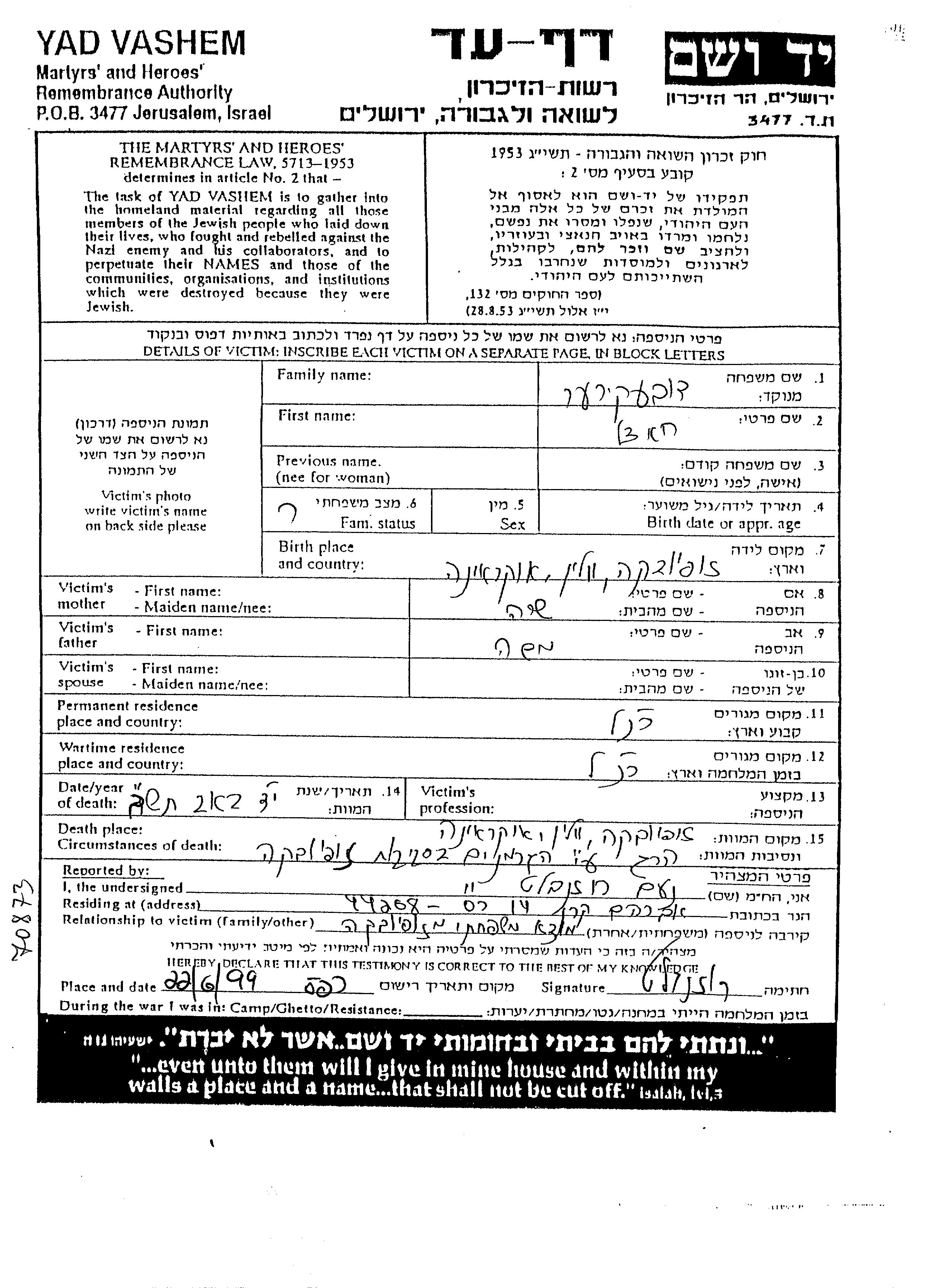 Yad Vashem - Pages of Testimony Names Memorial Collection
