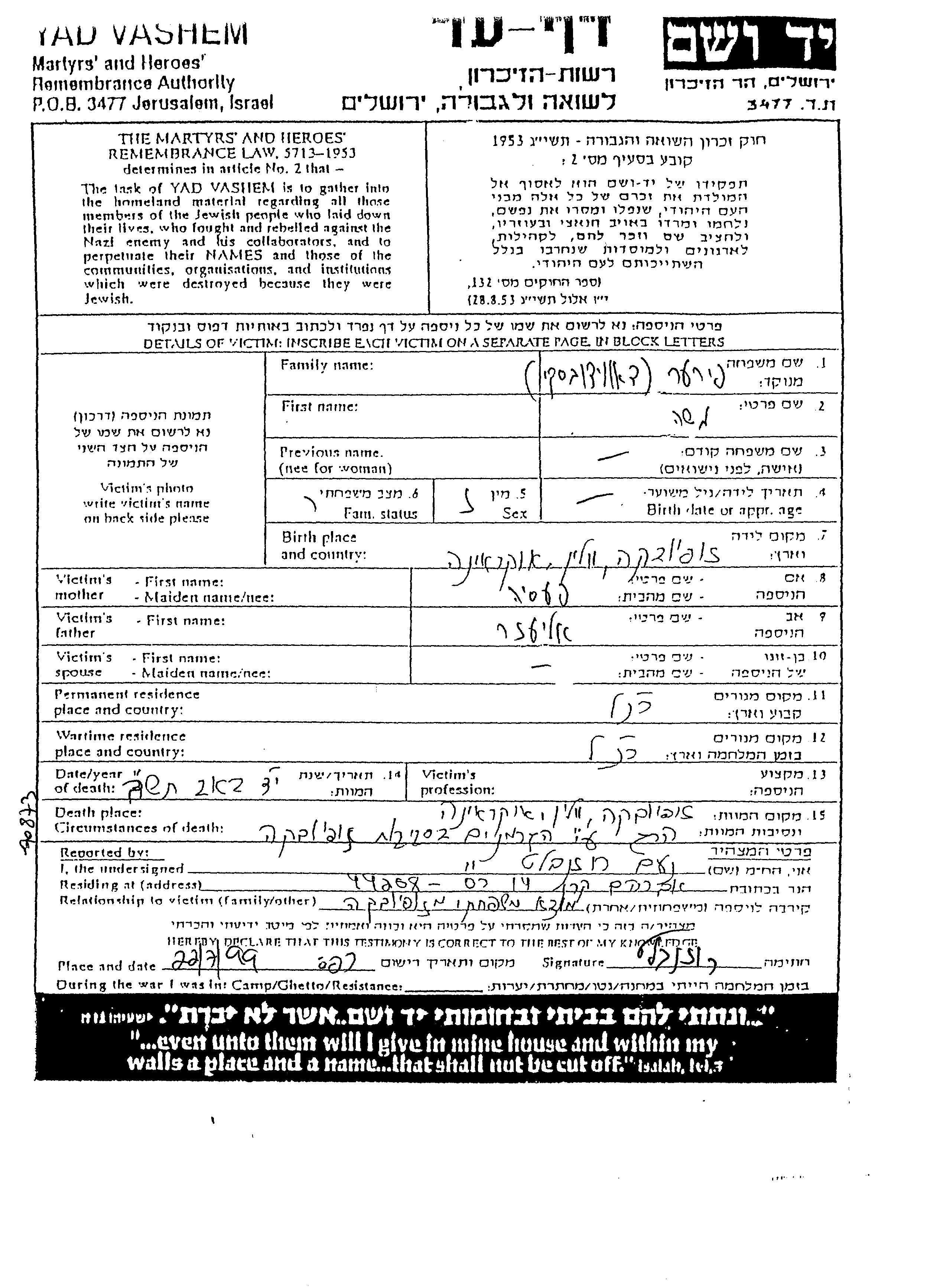 Yad Vashem - Pages of Testimony Names Memorial Collection