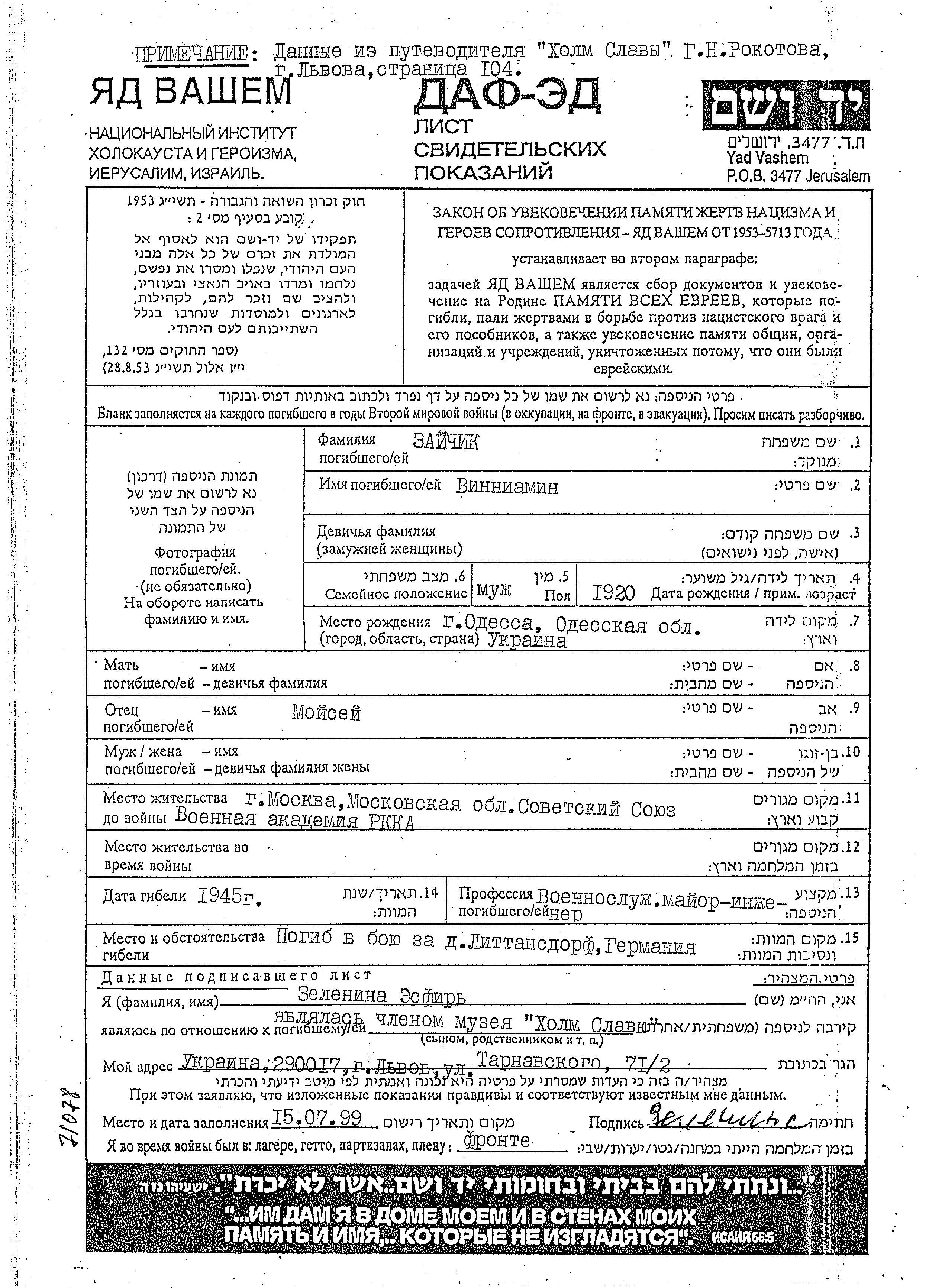Zaychik Vinniamin 1920 Moskva, Russie (URSS) Feuille de témoignage