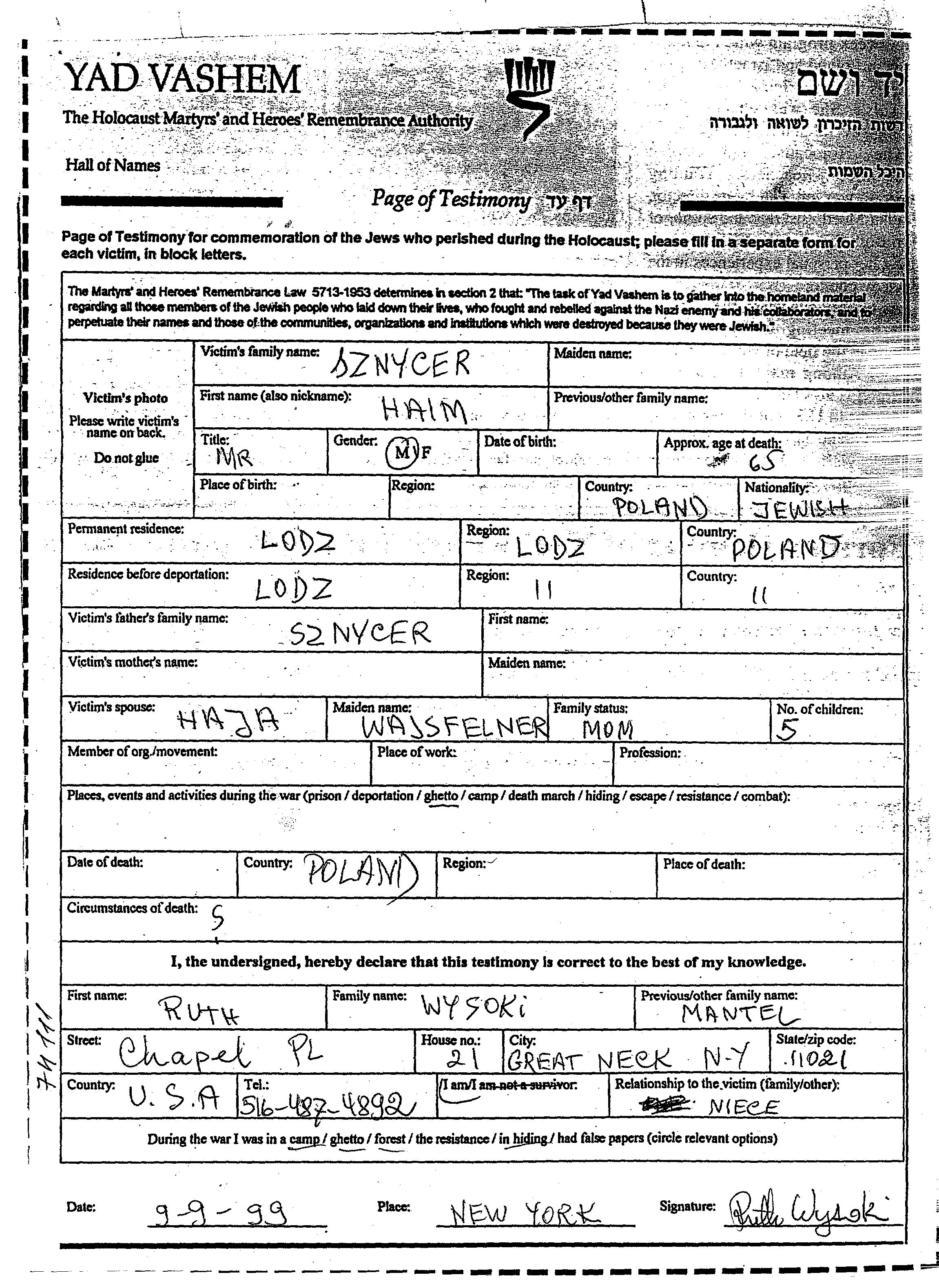 Haim Sznycer. Il était Mariée à Haja née Wajsfelner. Avant la seconde guerre mondiale il vivait à Lodz, Pologne. Au cours de la guerre, il était à Ghetto.