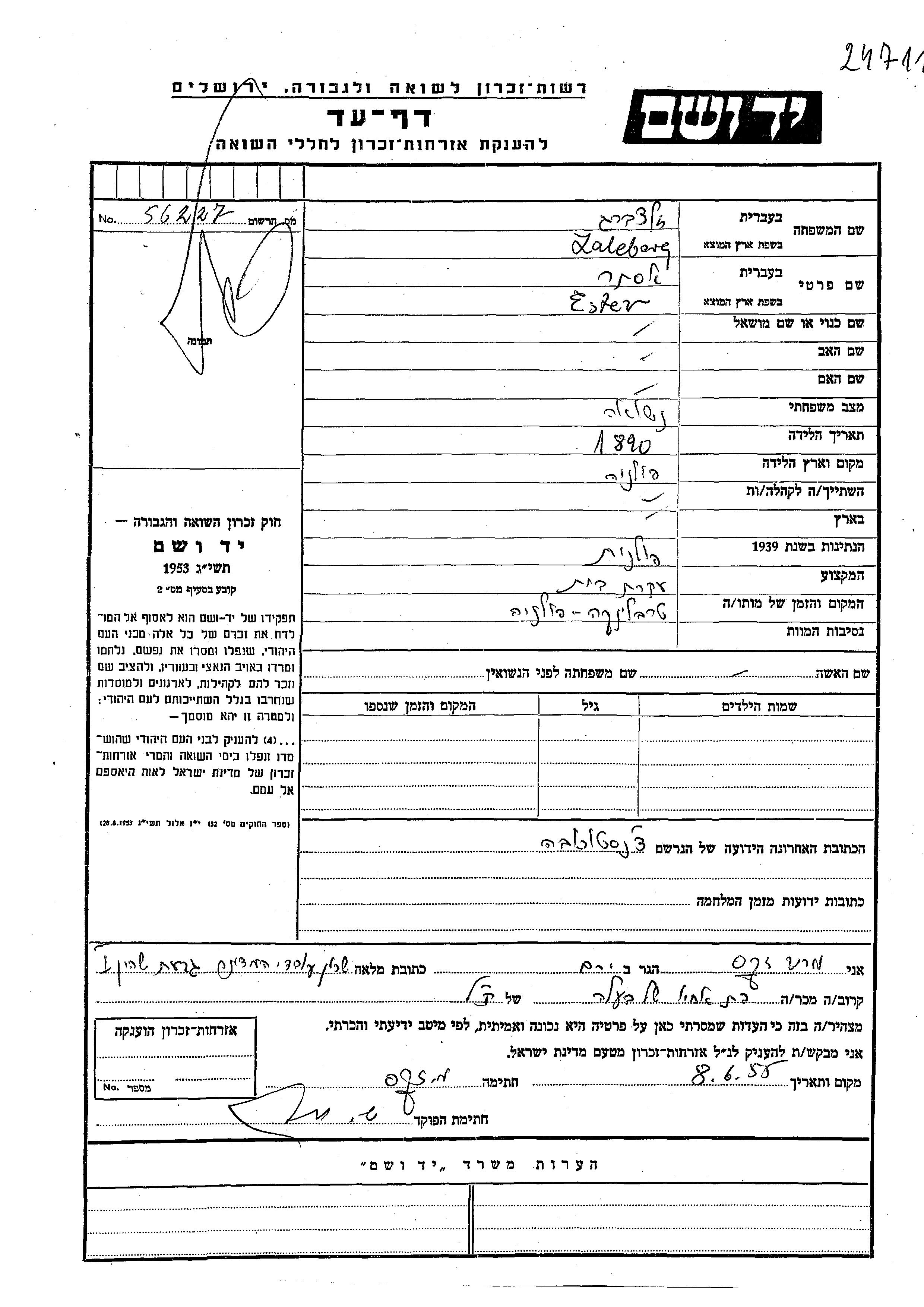 Zalcberg Ester 1890 endroit inconnu, Feuille de témoignage