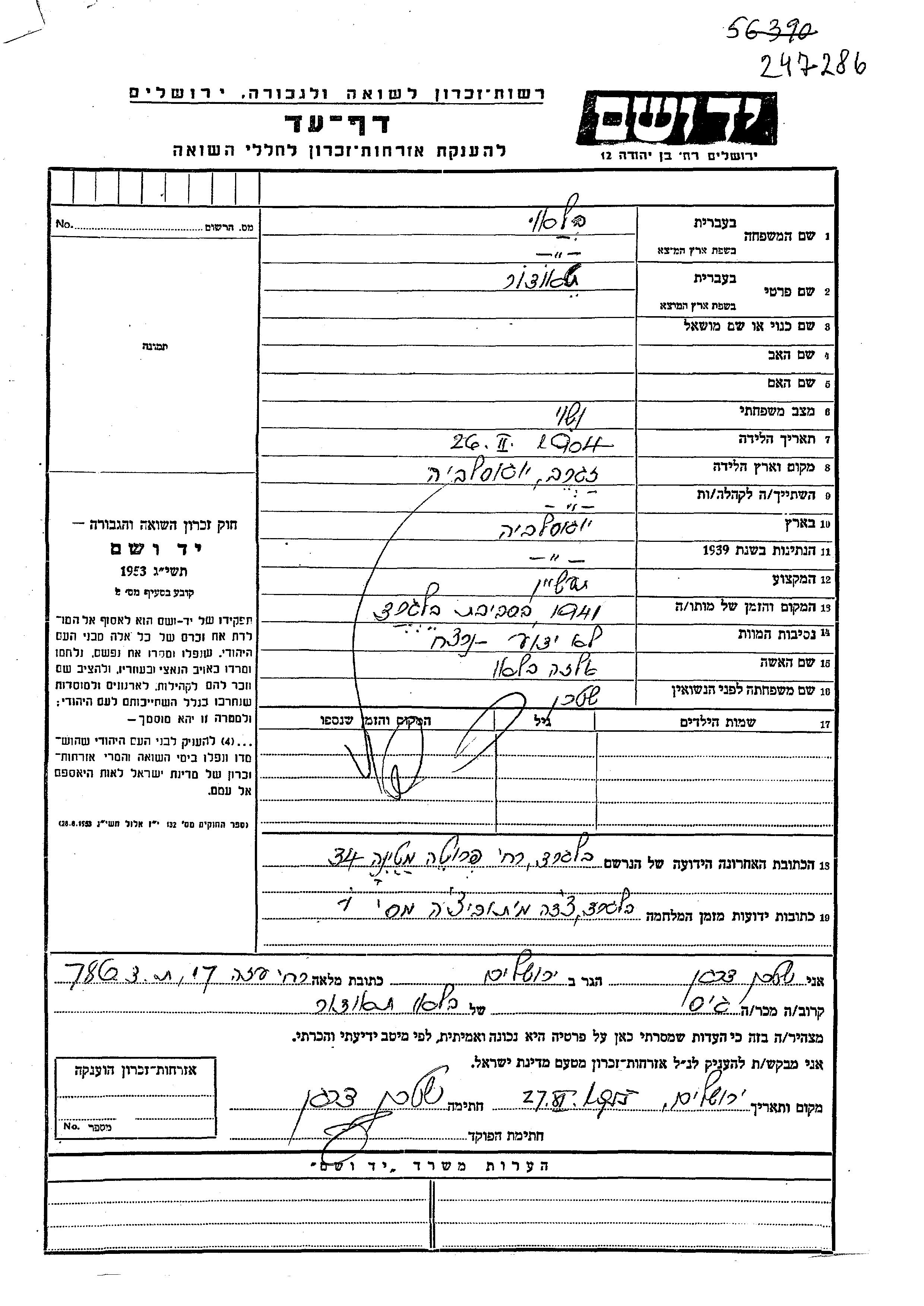 Yad Vashem - Pages of Testimony Names Memorial Collection