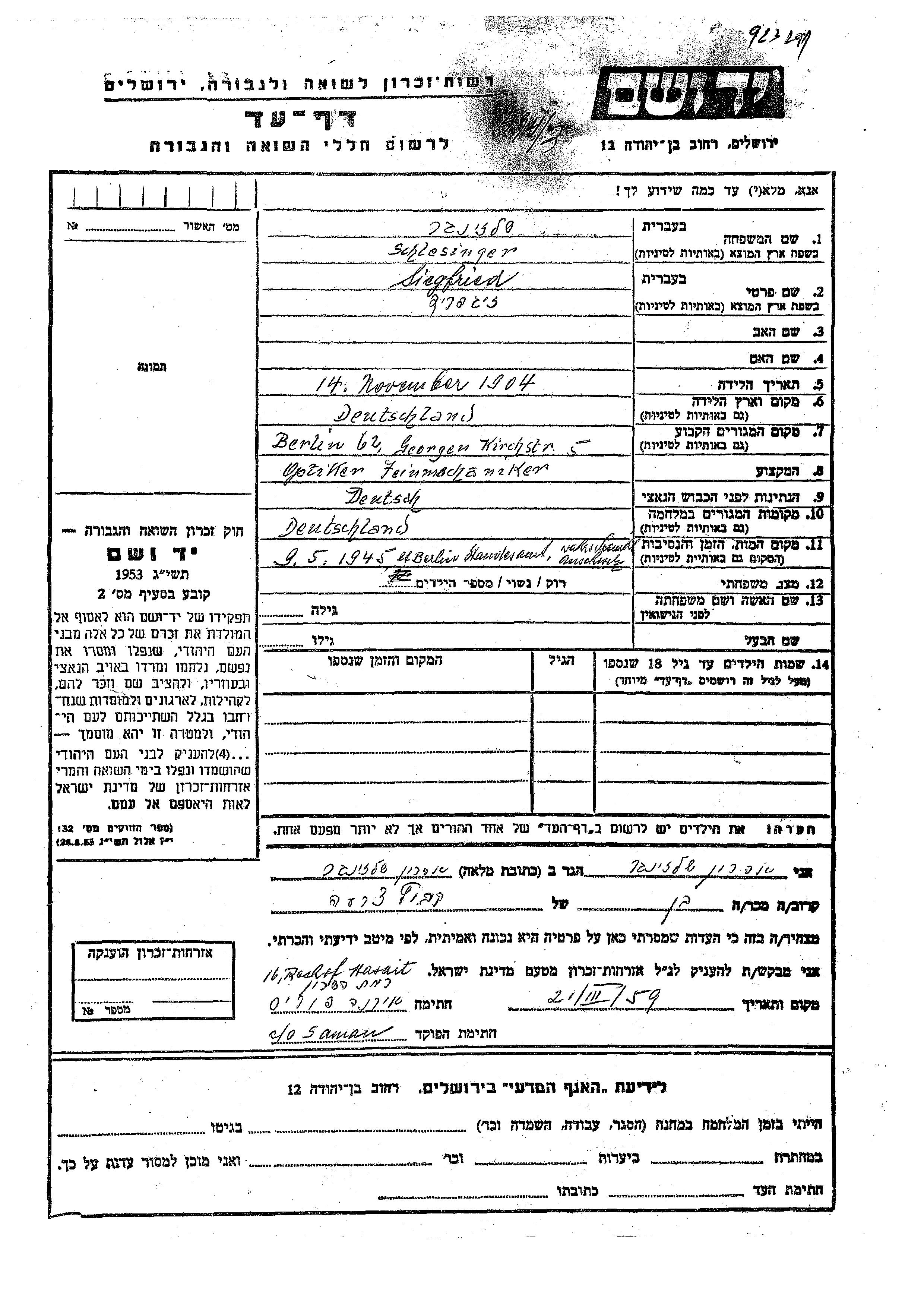 Schlesinger Siegfried 1904 Berlin, Allemagne Feuille de témoignage