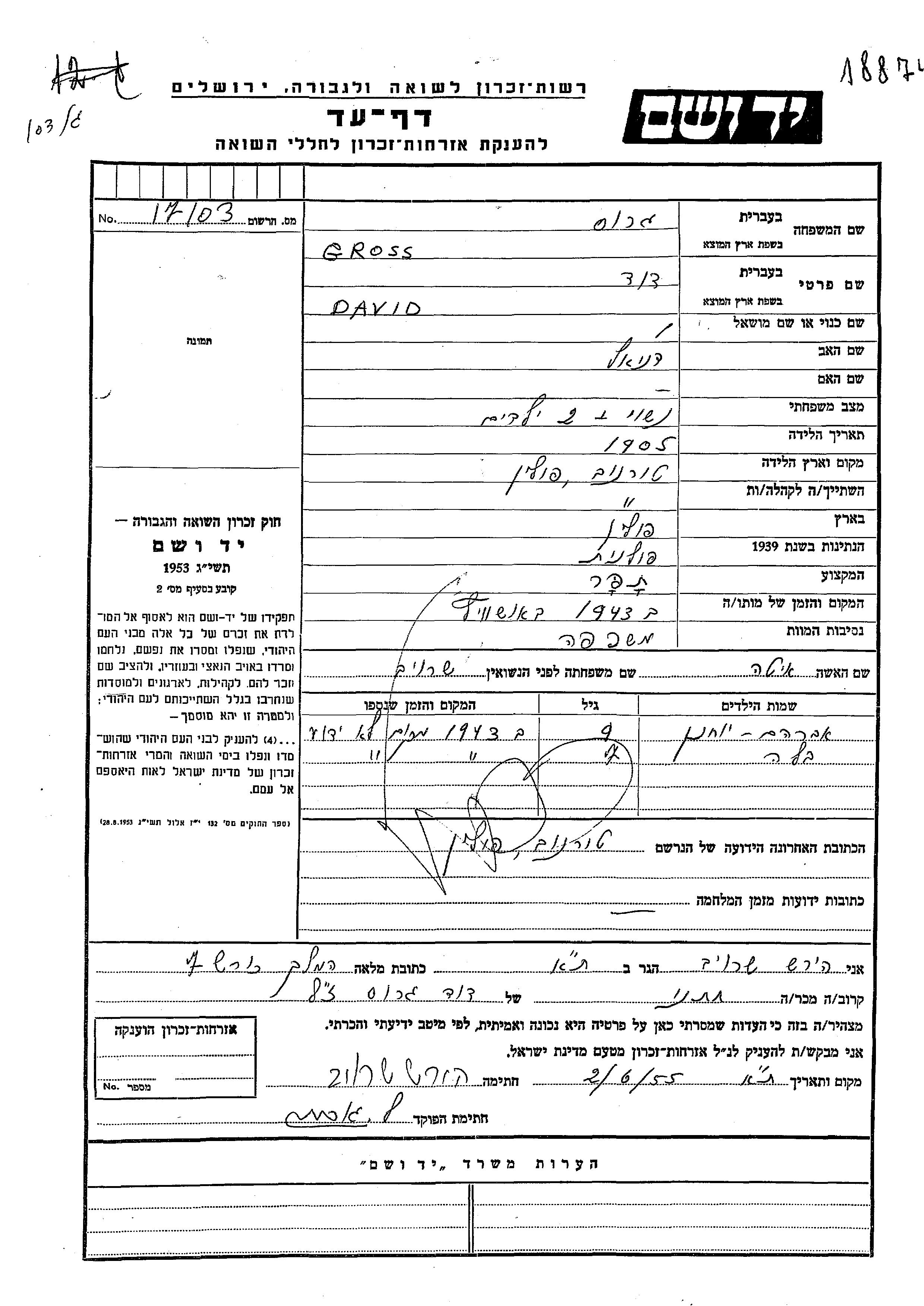 Gross David 1905 Tornow, Pologne Feuille de témoignage
