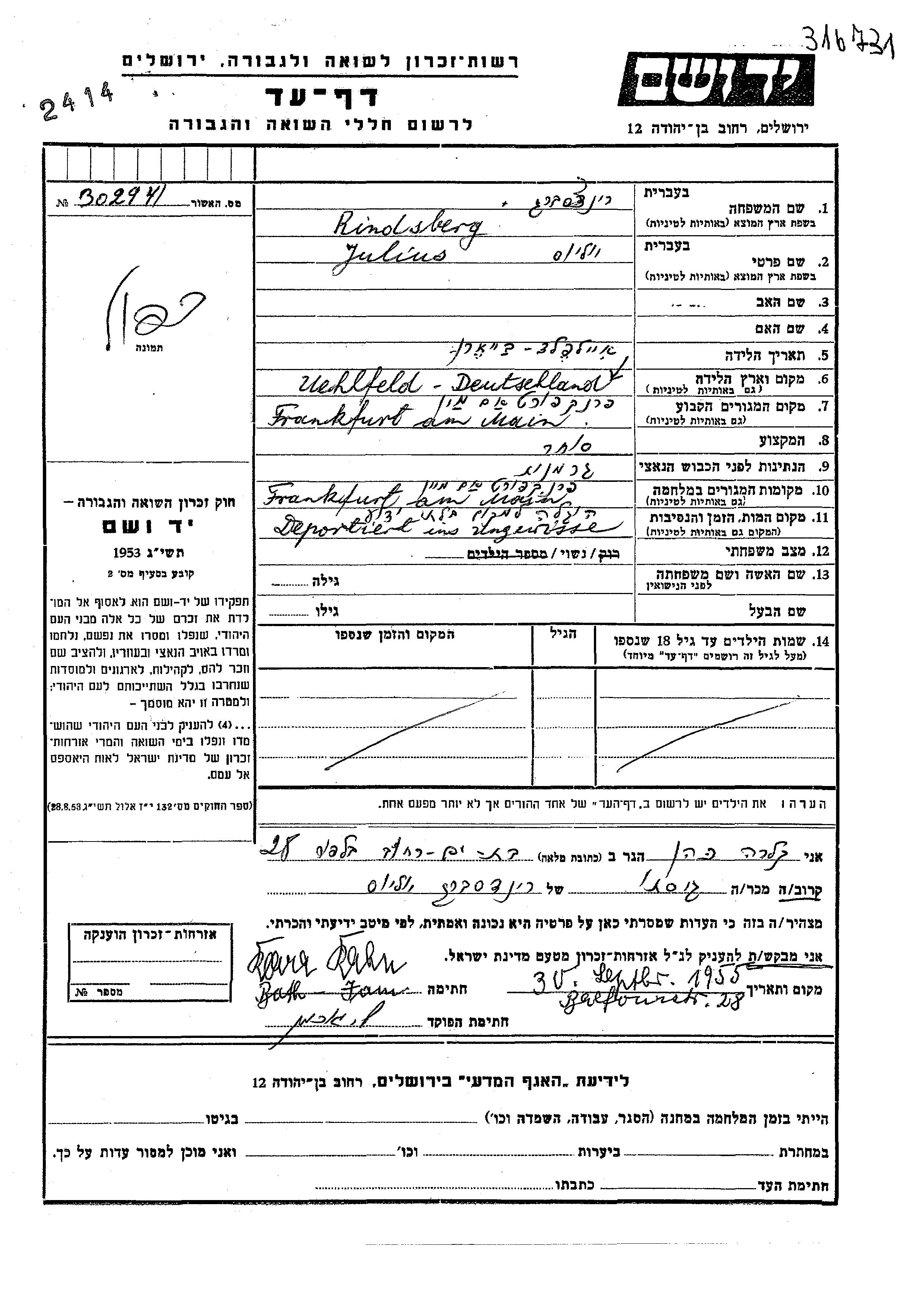 Rindsberg Julius Frankfurt am Main, Allemagne Feuille de témoignage
