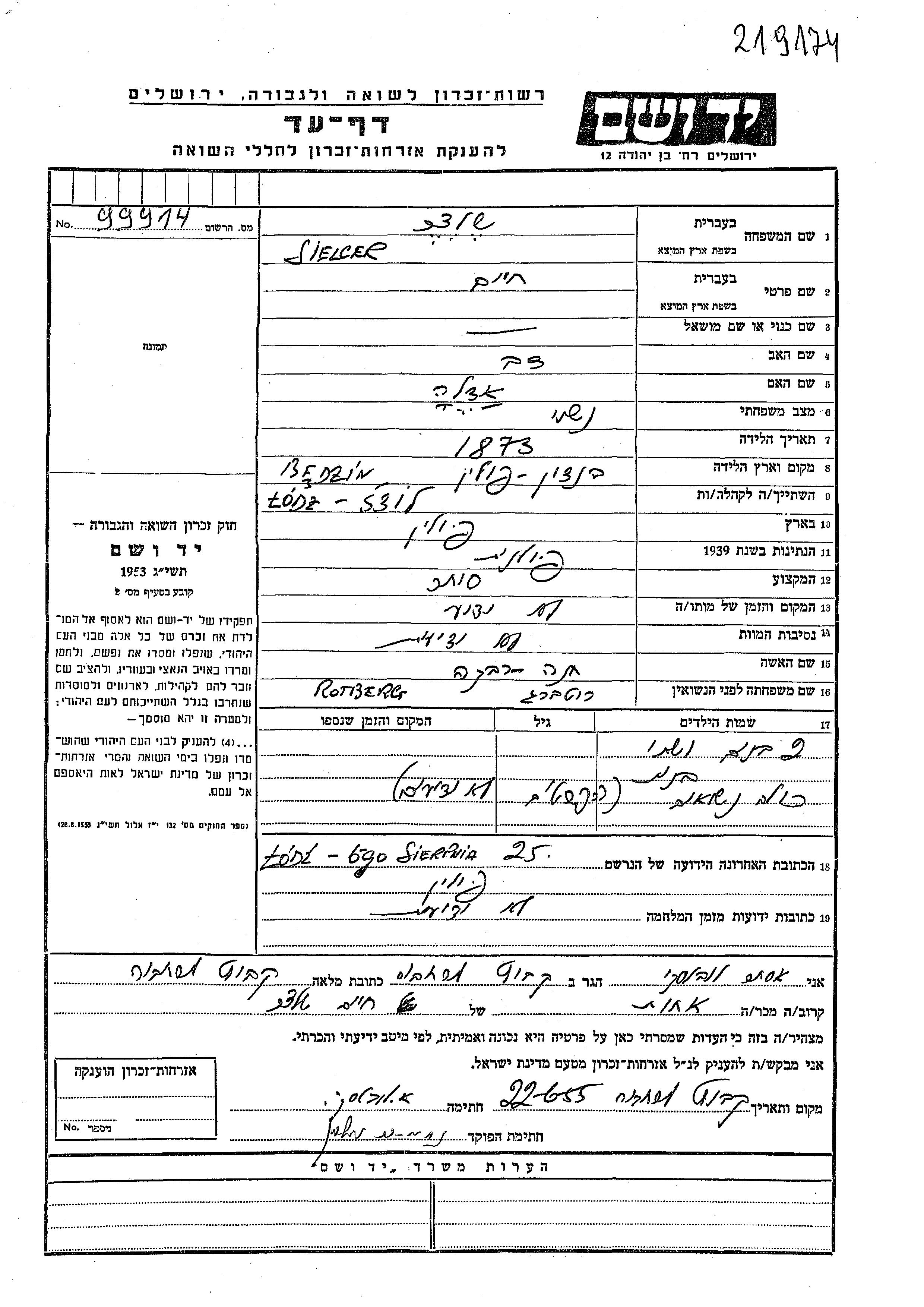 Khaim Sielcer est né à Będzin, Pologne en 1873, fils de Dov et de Adela. Il était Commerçant/e et Mariée à Khana Rivka née Rotberg. Avant la seconde guerre mondiale il vivait à Lodz, Pologne.
